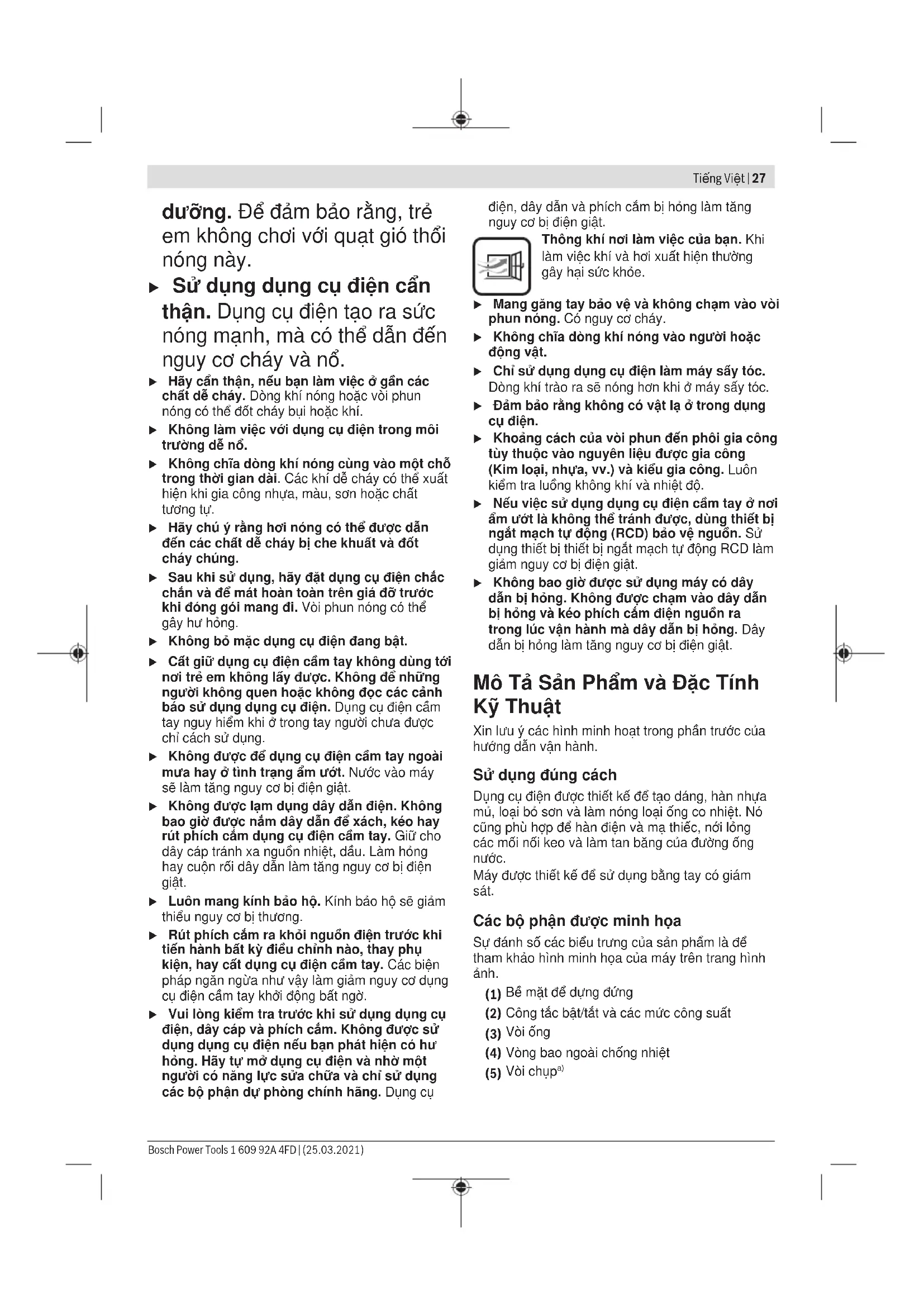 Tingkat daya I sesuai untuk mendinginkan benda kerja yang dipanaskan atau untuk mengeringkan cat. Tingkat daya tersebut juga sesuai untuk mendinginkan perkakas listrik sebelum dimatikan atau sebelum penggantian nosel. Petunjuk pengoperasian u Sebelum mulai dengan pekerjaan pada perkakas listrik, tariklah steker dari stopkontak. Catatan: Jangan membawa nozel (3) terlalu dekat dengan benda kerja. Udara yang tidak dapat mengalir bisa membuat perkakas listrik menjadi terlalu panas. Mematikan perkakas listrik Matikan perkakas listrik dan letakkan di tempat penyimpanan (1) untuk mendinginkan atau untuk mengistirahatkan kedua tangan. u Berhati-hatilah dengan perkakas listrik yang dimatikan! Terdapat risiko luka bakar akibat nozel atau udara panas. Posisikan perkakas listrik pada permukaan yang datar dan stabil. Pastikan perkakas listrik tidak dapat jatuh. Pastikan kabel berada di luar area pengerjaan sehingga kabel tidak dapat menarik dan membuat perkakas listrik terjatuh. Matikan perkakas listrik jika tidak digunakan untuk waktu lama dan lepaskan steker. Contoh penggunaan (lihat gambar A–B) Gambar-gambar dari contoh penggunaan terdapat pada halaman bergambar. Jarak nozel dengan benda kerja disesuaikan dengan material yang dikerjakan (logam, plastik, dsb.) dan jenis pengerjaan yang diinginkan. Suhu optimal untuk tiap pemakaian ditentukan dengan uji coba. Selalu lakukan uji coba terlebih dulu terkait volume udara dan suhu. Mulai dengan jarak yang lebih besar dan level daya yang rendah. Sesuaikan jarak dan level daya sesuai kebutuhan. Jika Anda ragu dengan jenis material yang dikerjakan atau dampak udara panas terhadap material, maka lakukanlah uji coba terhadap efeknya di area yang tersembunyi. Anda dapat bekerja tanpa aksesori untuk semua contoh penggunaan kecuali "Membersihkan cat pada bingkai jendela". Akan tetapi dengan menggunakan aksesori yang disarankan, pekerjaan menjadi lebih mudah dan hasil kerja menjadi jauh lebih bagus. Nozel yang tersedia sebagai aksesori kompatibel dengan semua model pistol pemanas udaraBosch. u Hati-hati saat mengganti nozel! Jangan menyentuh nozel yang panas. Biarkan perkakas listrik menjadi dingin dan pakailah sarung tangan pelindung saat mengganti. Nozel yang panas dapat mengakibatkan luka bakar. Supaya perkakas listrik menjadi dingin lebih cepat, biarkan perkakas listrik beroperasi sebentar pada suhu terendah. Membersihkan cat pada bingkai jendela (lihat gambarA) u Gunakan nozel pelindung kaca (5) (aksesori). Kaca jendela bisa pecah. Bosch Power Tools 1 609 92A 4FD | (25.03.2021)26 | Tiếng Việt Pada permukaan yang berlekuk, cat dapat dibersihkan dengan pengikis yang sesuai dan disikat dengan sikat kawat yang lunak. Menyolder (lihat gambar B) Pasang nozel reduksi (6) (aksesori). Jika digunakan bahan tambahan tanpa obat solder, berikan minyak solder atau pasta pada tempat yang disolder. Tempat yang disolder dipanaskan selama kira-kira 50 sampai 120 detik, tergantung dari bahan yang dikerjakan. Bubuhkan bahan tambahan. Bahan tambahan akan mencair akibat suhu benda kerja. Setelah tempat yang disolder menjadi dingin, bersihkan obat solder. Perawatan dan servis Perawatan dan pembersihan u Sebelum mulai dengan pekerjaan pada perkakas listrik, tariklah steker dari stopkontak. u Perkakas listrik dan lubang ventilasi harus selalu dibersihkan agar perkakas dapat digunakan dengan baik dan aman. Jika kabel listrik harus diganti, pekerjaan ini harus dilakukan oleh Bosch atau Service Center untuk perkakas listrik Bosch resmi agar keselamatan kerja selalu terjamin. Layanan pelanggan dan konsultasi penggunaan Layanan pelanggan Bosch menjawab semua pertanyaan Anda tentang reparasi dan perawatan serta tentang suku cadang produk ini. Gambaran teknis (exploded view) dan informasi mengenai suku cadang dapat ditemukan di: www.bosch-pt.com Tim konsultasi penggunaan Bosch akan membantu Anda menjawab pertanyaan seputar produk kami beserta aksesorinya. Jika Anda hendak menanyakan sesuatu atau memesan suku cadang, selalu sebutkan nomor model yang terdiri dari 10 angka dan tercantum pada label tipe produk. Indonesia PT Robert Bosch Palma Tower 10th Floor Jalan RA Kartini II-S Kaveling 6 Pondok Pinang, Kebayoran Lama Jakarta Selatan 12310 Tel.: (021) 3005 5800 Fax: (021) 3005 5801 E-Mail: boschpowertools@id.bosch.com www.bosch-pt.co.id Alamat layanan lainnya dapat ditemukan di: www.bosch-pt.com/serviceaddresses Cara membuang Perkakas listrik, aksesori, dan kemasan sebaiknya didaur ulang secara ramah lingkungan. Jangan membuang perkakas listrik ke dalam sampah rumah tangga! Tiếng Việt Hướng dẫn an toàn Đọc kỹ mọi cảnh báo an toàn và mọi hướng dẫn. Không tuân thủ mọi cảnh báo và hướng dẫn được liệt kê dưới đây có thể bị điện giật, gây cháy và / hay bị thương tật nghiêm trọng. Hãy giữ tất cả tài liệu về cảnh báo và hướng dẫn để tham khảo về sau. u Loại quạt gió thổi nóng này không nhằm mục đích sử dụng cho trẻ em và những người bị hạn chế về thể chất, tinh thần hoặc thiếu nhận biết hoặc thiếu kinh nghiệm hoặc thiếu kiến thức. Quạt gió thổi nóng này có thể dành cho trẻ em từ 8 tuổi trở lên và người bị hạn chế về thể chất, khả năng giác quan kém hoặc tâm thần hoặc thiếu kinh nghiệm và thiếu hiểu biết sử dụng, chỉ khi họ được một người chịu trách nhiệm cho sự an toàn của họ giám sát hoặc đã được người này hướng dẫn sử dụng quạt gió thổi nóng trong môi trường an toàn và hiểu được những nguy hiểm có liên quan. Nếu không sẽ có nguy cơ sai sót khi vận hành và bị thương tích. u Hãy giám sát trẻ nhỏ khi sử dụng, làm sạch và bảo 1 609 92A 4FD | (25.03.2021) Bosch Power ToolsTiếng Việt | 27 dưỡng. Để đảm bảo rằng, trẻ em không chơi với quạt