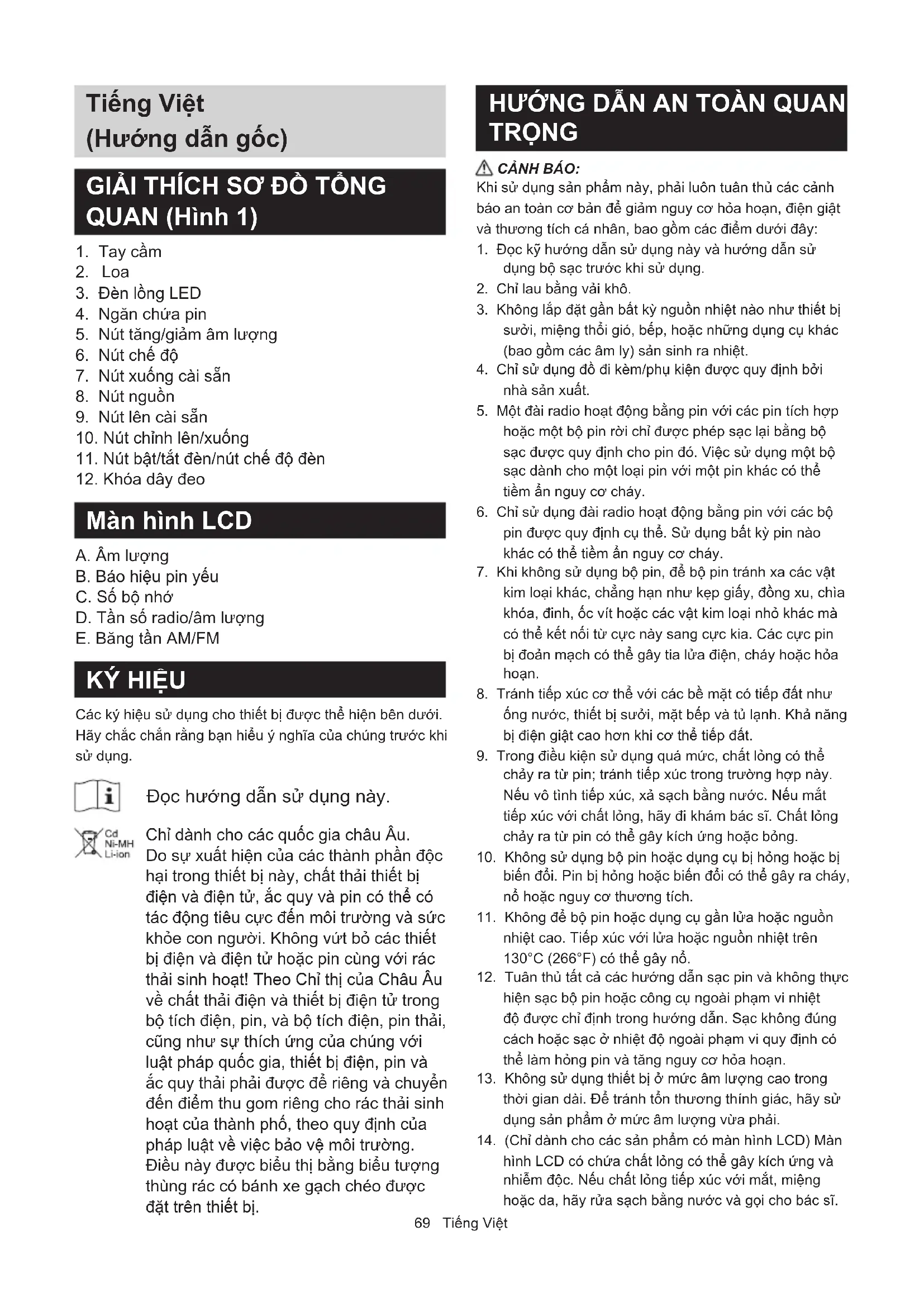 Các ký hiệu sử dụng cho thiết bị được thể hiện bên dưới. Hãy chắc chắn rằng bạn hiểu ý nghĩa của chúng trước khi sử dụng. Đọc hướng dẫn sử dụng này. Chỉ dành cho các quốc gia châu Âu. Do sự xuất hiện của các thành phần độc hại trong thiết bị này, chất thải thiết bị điện và điện tử, ắc quy và pin có thể có tác động tiêu cực đến môi trường và sức khỏe con người. Không vứt bỏ các thiết bị điện và điện tử hoặc pin cùng với rác thải sinh hoạt! Theo Chỉ thị của Châu Âu về chất thải điện và thiết bị điện tử trong bộ tích điện, pin, và bộ tích điện, pin thải, cũng như sự thích ứng của chúng với luật pháp quốc gia, thiết bị điện, pin và ắc quy thải phải được để riêng và chuyển đến điểm thu gom riêng cho rác thải sinh hoạt của thành phố, theo quy định của pháp luật về việc bảo vệ môi trường. Điều này được biểu thị bằng biểu tượng thùng rác có bánh xe gạch chéo được đặt trên thiết bị. HƯỚNG DẪN AN TOÀN QUAN TRỌNG CẢNH BÁO: Khi sử dụng sản phẩm này, phải luôn tuân thủ các cảnh báo an toàn cơ bản để giảm nguy cơ hỏa hoạn, điện giật và thương tích cá nhân, bao gồm các điểm dưới đây: