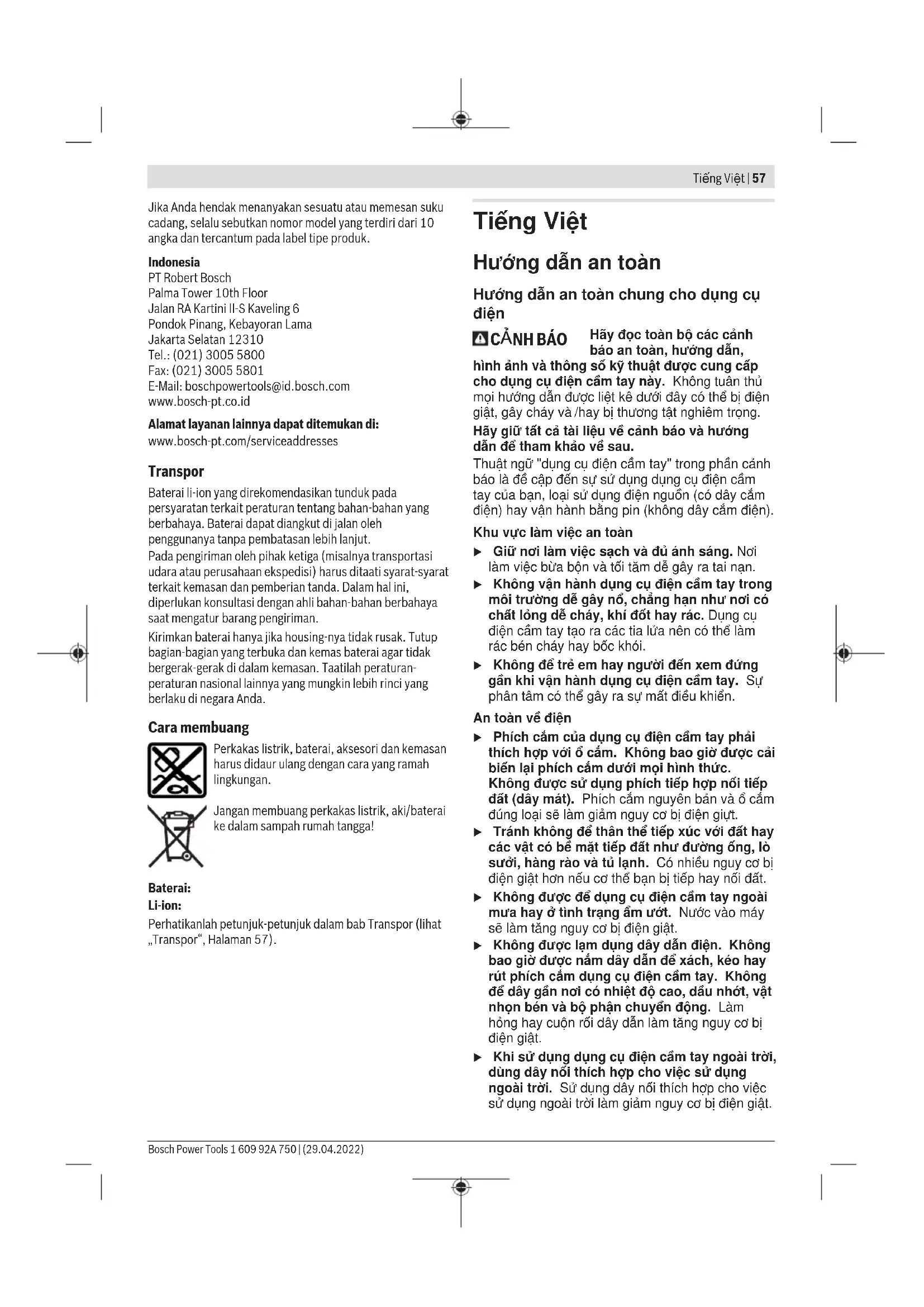 Hãy đọc toàn bộ các cảnh báo an toàn, hướng dẫn, hình ảnh và thông số kỹ thuật được cung cấp cho dụng cụ điện cầm tay này. Không tuân thủ mọi hướng dẫn được liệt kê dưới đây có thể bị điện giật, gây cháy và /hay bị thương tật nghiêm trọng. Hãy giữ tất cả tài liệu về cảnh báo và hướng dẫn để tham khảo về sau. Thuật ngữ "dụng cụ điện cầm tay" trong phần cảnh báo là đề cập đến sự sử dụng dụng cụ điện cầm tay của bạn, loại sử dụng điện nguồn (có dây cắm điện) hay vận hành bằng pin (không dây cắm điện). Khu vực làm việc an toàn u Giữ nơi làm việc sạch và đủ ánh sáng. Nơi làm việc bừa bộn và tối tăm dễ gây ra tai nạn. u Không vận hành dụng cụ điện cầm tay trong môi trường dễ gây nổ, chẳng hạn như nơi có chất lỏng dễ cháy, khí đốt hay rác. Dụng cụ điện cầm tay tạo ra các tia lửa nên có thể làm rác bén cháy hay bốc khói. u Không để trẻ em hay người đến xem đứng gần khi vận hành dụng cụ điện cầm tay. Sự phân tâm có thể gây ra sự mất điều khiển. An toàn về điện u Phích cắm của dụng cụ điện cầm tay phải thích hợp với ổ cắm. Không bao giờ được cải biến lại phích cắm dưới mọi hình thức. Không được sử dụng phích tiếp hợp nối tiếp đất (dây mát). Phích cắm nguyên bản và ổ cắm đúng loại sẽ làm giảm nguy cơ bị điện giựt. u Tránh không để thân thể tiếp xúc với đất hay các vật có bề mặt tiếp đất như đường ống, lò sưởi, hàng rào và tủ lạnh. Có nhiều nguy cơ bị điện giật hơn nếu cơ thể bạn bị tiếp hay nối đất. u Không được để dụng cụ điện cầm tay ngoài mưa hay ở tình trạng ẩm ướt. Nước vào máy sẽ làm tăng nguy cơ bị điện giật. u Không được lạm dụng dây dẫn điện. Không bao giờ được nắm dây dẫn để xách, kéo hay rút phích cắm dụng cụ điện cầm tay. Không để dây gần nơi có nhiệt độ cao, dầu nhớt, vật nhọn bén và bộ phận chuyển động. Làm hỏng hay cuộn rối dây dẫn làm tăng nguy cơ bị điện giật. u Khi sử dụng dụng cụ điện cầm tay ngoài trời, dùng dây nối thích hợp cho việc sử dụng ngoài trời. Sử dụng dây nối thích hợp cho việc sử dụng ngoài trời làm giảm nguy cơ bị điện giật. Bosch Power Tools 1 609 92A 750 | (29.04.2022)58 | Tiếng Việt u Nếu việc sử dụng dụng cụ điện cầm tay ở nơi ẩm ướt là không thể tránh được, dùng thiết bị ngắt mạch tự động (RCD) bảo vệ nguồn. Sử dụng thiết bị ngắt mạch tự động RCD làm giảm nguy cơ bị điện giựt. An toàn cá nhân u Hãy tỉnh táo, biết rõ mình đang làm gì và hãy sử dụng ý thức khi vận hành dụng cụ điện cầm tay. Không sử dụng dụng cụ điện cầm tay khi đang mệt mỏi hay đang bị tác động do chất gây nghiện, rượu hay dược phẩm gây ra. Một thoáng mất tập trung khi đang vận hành dụng cụ điện cầm tay có thể gây thương tích nghiêm trọng cho bản thân. u Sử dụng trang bị bảo hộ cá nhân. Luôn luôn đeo kính bảo vệ mắt. Trang bị bảo hộ như khẩu trang, giày chống trợt, nón bảo hộ, hay dụng cụ bảo vệ tai khi được sử dụng đúng nơi đúng chỗ sẽ làm giảm nguy cơ thương tật cho bản thân. u Phòng tránh máy khởi động bất ngờ. Bảo đảm công tắc máy ở vị trí tắt trước khi cắm vào nguồn điện và/hay lắp pin vào, khi nhấc máy lên hay khi mang xách máy. Ngáng ngón tay vào công tắc máy để xách hay kích hoạt dụng cụ điện cầm tay khi công tắc ở vị trí mở dễ dẫn đến tai nạn. u Lấy mọi chìa hay khóa điều chỉnh ra trước khi mở điện dụng cụ điện cầm tay. Khóa hay chìa còn gắn dính vào bộ phận quay của dụng cụ điện cầm tay có thể gây thương tích cho bản thân. u Không rướn người. Luôn luôn giữ tư thế đứng thích hợp và thăng bằng. Điều này tạo cho việc điều khiển dụng cụ điện cầm tay tốt hơn trong mọi tình huống bất ngờ. u Trang phục thích hợp. Không mặc quần áo rộng lùng thùng hay mang trang sức. Giữ tóc và quần áo xa khỏi các bộ phận chuyển động. Quần áo rộng lùng thùng, đồ trang sức hay tóc dài có thể bị cuốn vào các bộ phận chuyển động. u Nếu có các thiết bị đi kèm để nối máy hút bụi và các phụ kiện khác, bảo đảm các thiết bị này được nối và sử dụng tốt. Việc sử dụng các thiết bị gom hút bụi có thể làm giảm các độc hại liên quan đến bụi gây ra. u Không để thói quen do sử dụng thường xuyên dụng cụ khiến bạn trở nên chủ quan và bỏ qua các quy định an toàn dụng cụ. Một hành vi bất cẩn có thể gây ra thương tích nghiêm trọng chỉ trong tíc tắc. Sử dụng và bảo dưỡng dụng cụ điện cầm tay u Không được ép máy. Sử dụng dụng cụ điện cầm tay đúng loại theo đúng ứng dụng của bạn. Dụng cụ điện cầm tay đúng chức năng sẽ làm việc tốt và an toàn hơn theo đúng tiến độ mà máy được thiết kế. u Không sử dụng dụng cụ điện cầm tay nếu như công tắc không tắt và mở được. Bất kỳ dụng cụ điện cầm tay nào mà không th