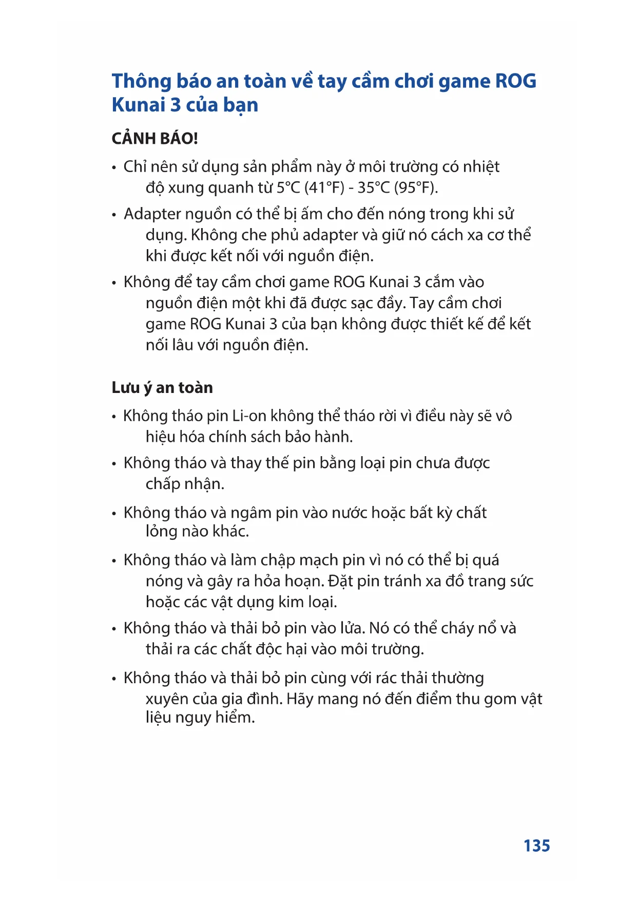 - Không để tay cầm chơi game ROG Kunai 3 cắm vào nguồn điện một khi đã được sạc đầy. Tay cầm chơi game ROG Kunai 3 của bạn không được thiết kế để kết nối lâu với nguồn điện. Lưu ý an toàn