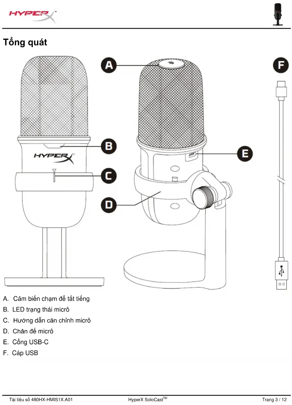 Tổng quát A. Cảm biến chạm để tắt tiếng B. LED trạng thái micrô C. Hướng dẫn căn chỉnh micrô D. Chân đế micrô E. Cổng USB-C F. Cáp USBTài liệu số 480HX-HMIS1X.A01 HyperX SoloCast