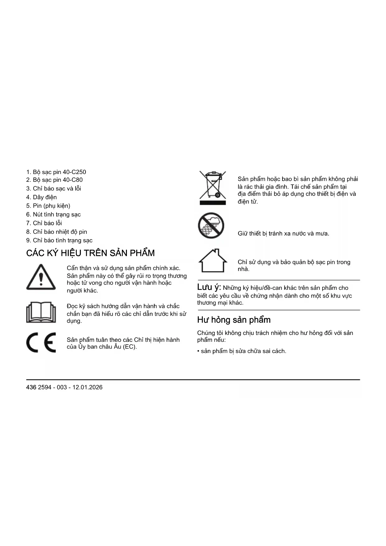 - sản phẩm bị sửa chữa sai cách. 436 2594 - 003 - 12.01.2026• sản phẩm được sửa chữa bằng các bộ phận không do nhà sản xuất cung cấp hoặc không được nhà sản xuất phê duyệt.