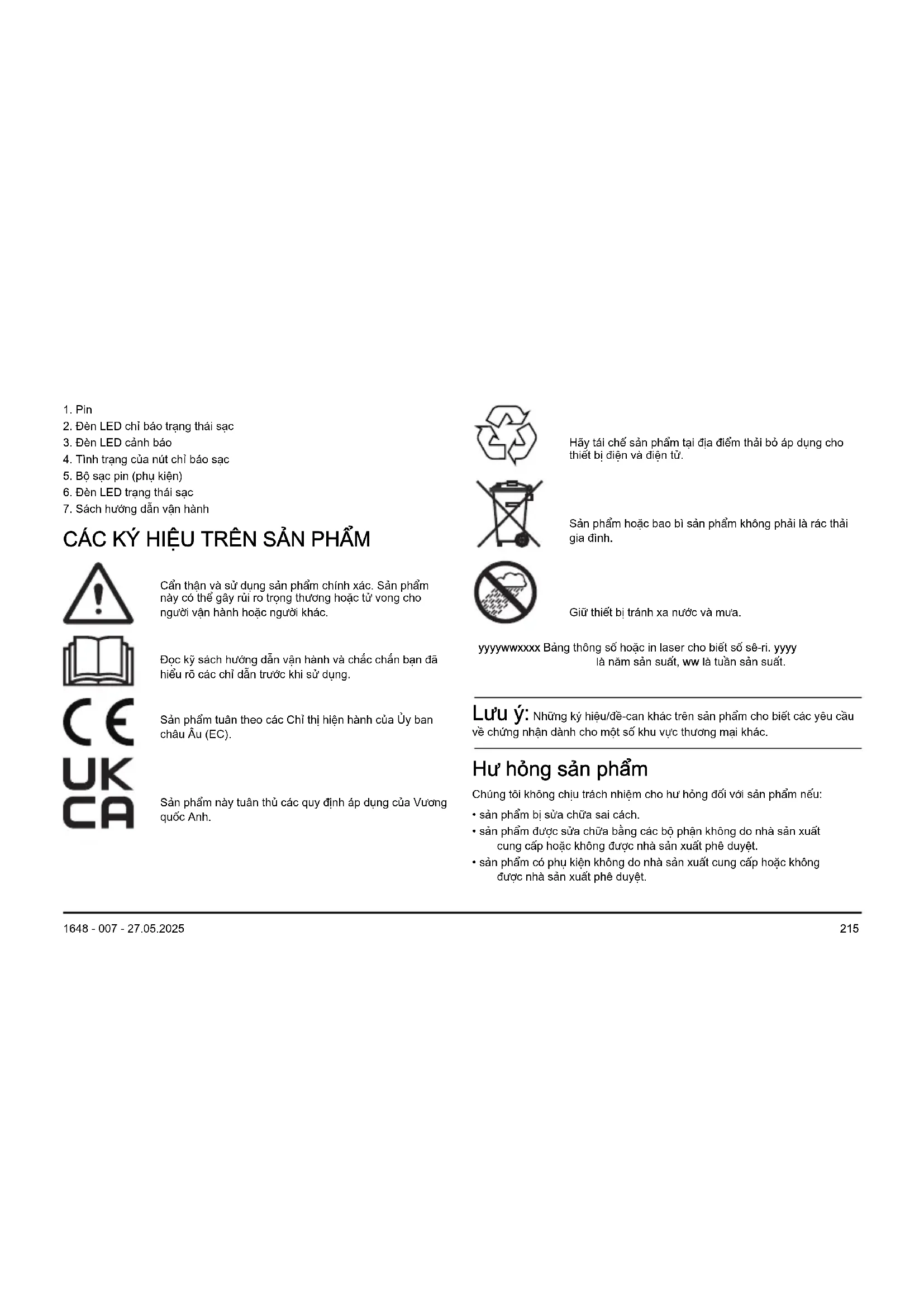 1648 - 007 - 27.05.2025• Tháo pin khỏi sản phẩm khi bạn không sử dụng và trong quá trình vận chuyển.