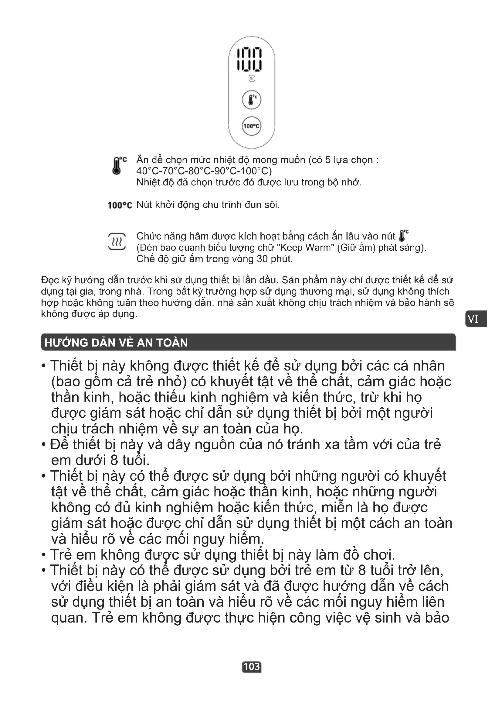 Chế độ giữ ấm trong vòng 30 phút. Đọc kỹ hướng dẫn trước khi sử dụng thiết bị lần đầu. Sản phẩm này chỉ được thiết kế để sử dụng tại gia, trong nhà. Trong bất kỳ trường hợp sử dụng thương mại, sử dụng không thích hợp hoặc không tuân theo hướng dẫn, nhà sản xuất không chịu trách nhiệm và bảo hành sẽ không được áp dụng.104 dưỡng trừ khi các em có độ tuổi tối thiểu từ 8 tuổi trở lên và có sự giám sát của người lớn.