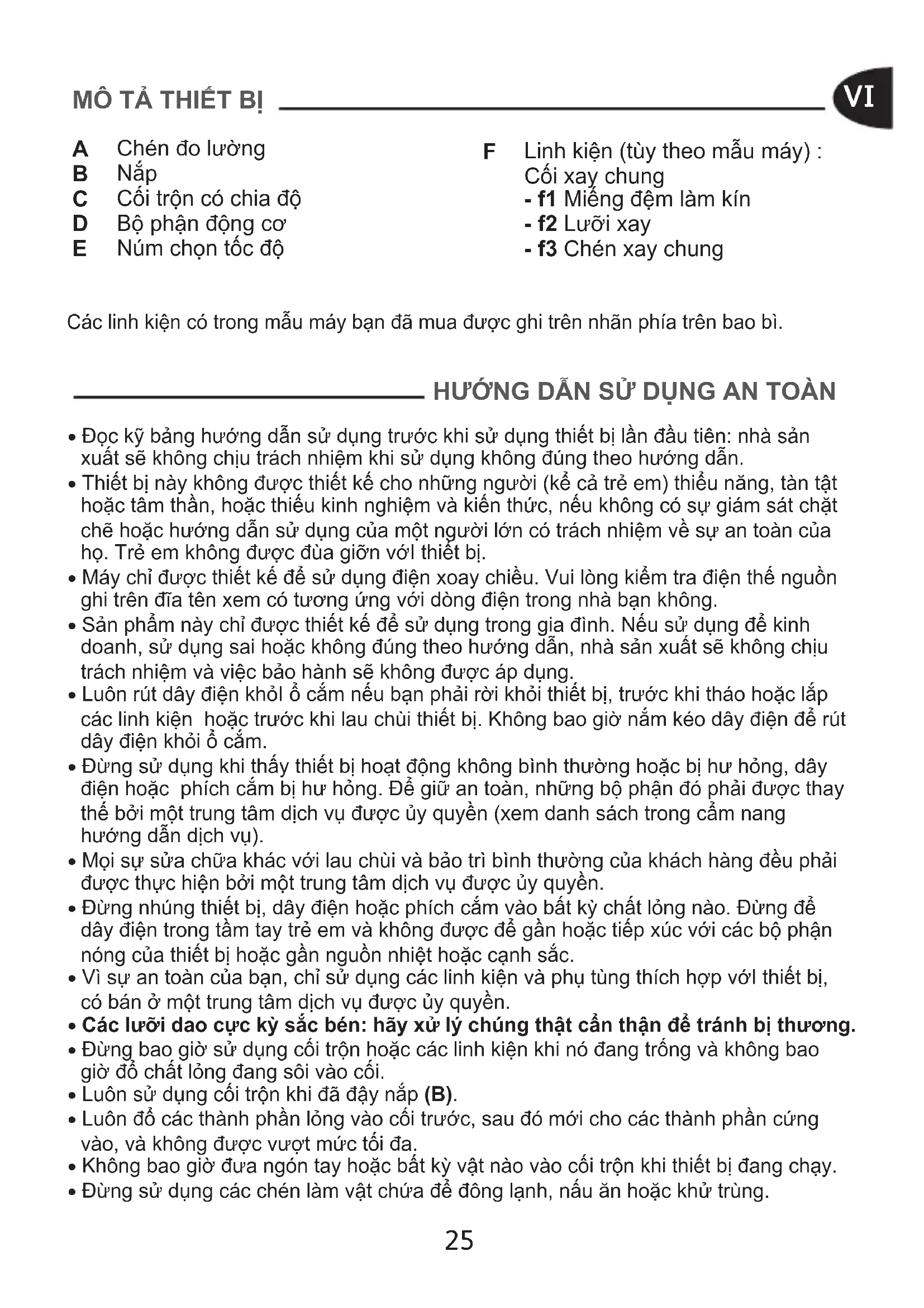 Các linh kiện có trong mẫu máy bạn đã mua được ghi trên nhãn phía trên bao bì. HƯỚNG DẪN SỬ DỤNG AN TOÀN