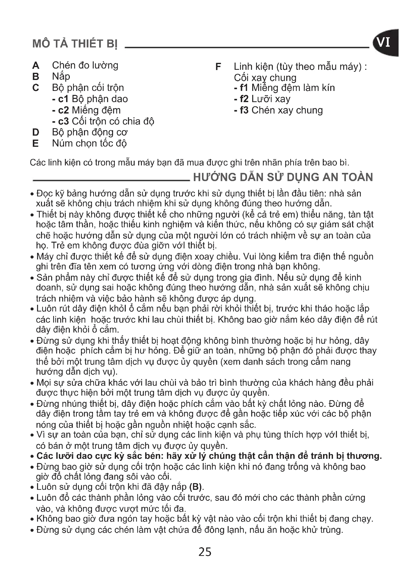 Các linh kiện có trong mẫu máy bạn đã mua được ghi trên nhãn phía trên bao bì. HƯỚNG DẪN SỬ DỤNG AN TOÀN