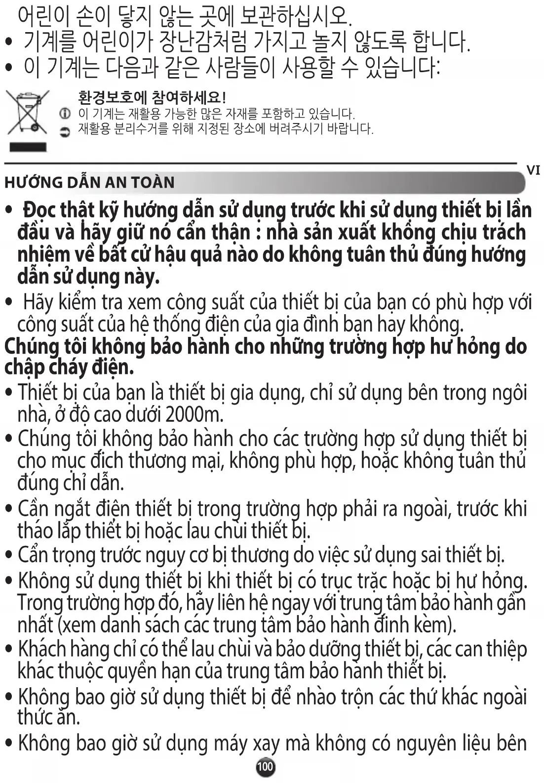 - Thiết bị này không được thiết kế phù hợp với những người bị suy giảm về thể lực, bị khuyết tật về giác quan hoặc tâm thần, hoặc thiếu kinh nghiệm và kiến thức tương tự (kể cả trẻ em), trừ khi họ được người có trách nhiệm đảm bảo an toàn giám sát hoặc hướng dẫn liên quan đến việc sử dụng thiết bị.