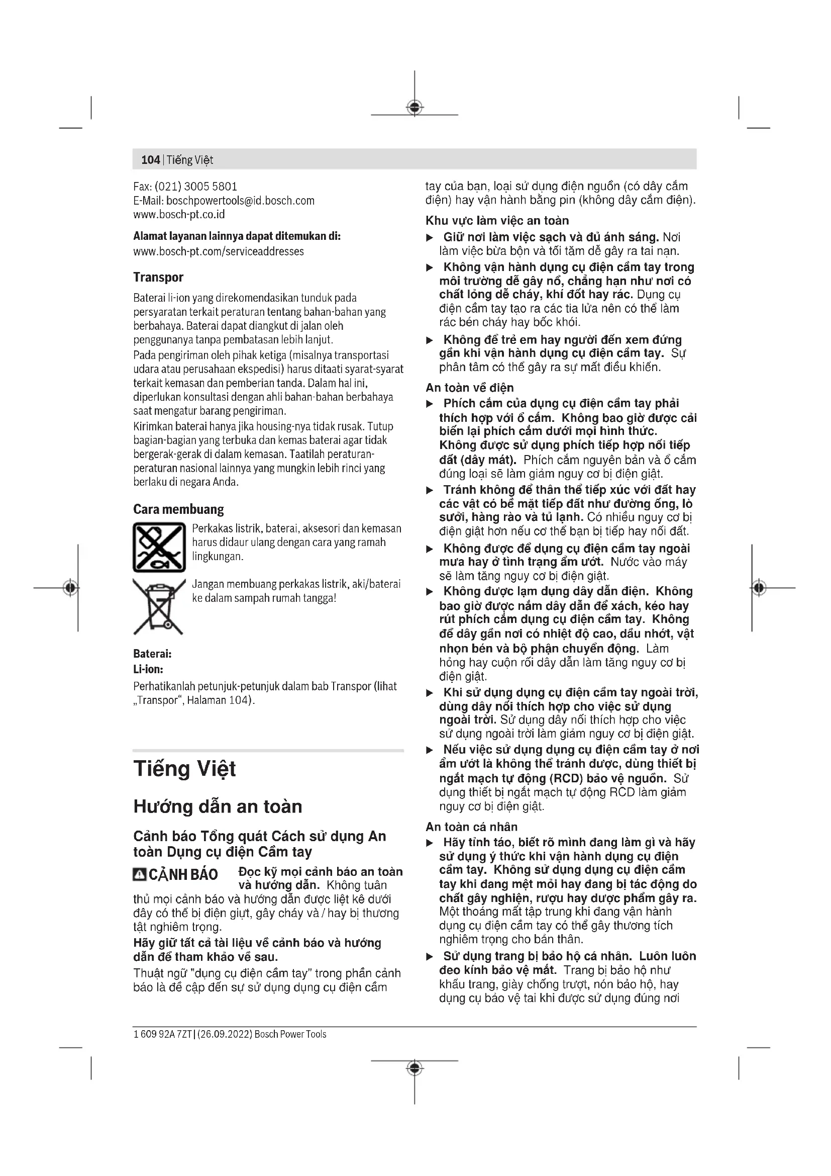 Đọc kỹ mọi cảnh báo an toàn và hướng dẫn. Không tuân thủ mọi cảnh báo và hướng dẫn được liệt kê dưới đây có thể bị điện giựt, gây cháy và / hay bị thương tật nghiêm trọng. Hãy giữ tất cả tài liệu về cảnh báo và hướng dẫn để tham khảo về sau. Thuật ngữ "dụng cụ điện cầm tay" trong phần cảnh báo là đề cập đến sự sử dụng dụng cụ điện cầm tay của bạn, loại sử dụng điện nguồn (có dây cắm điện) hay vận hành bằng pin (không dây cắm điện). Khu vực làm việc an toàn u Giữ nơi làm việc sạch và đủ ánh sáng. Nơi làm việc bừa bộn và tối tăm dễ gây ra tai nạn. u Không vận hành dụng cụ điện cầm tay trong môi trường dễ gây nổ, chẳng hạn như nơi có chất lỏng dễ cháy, khí đốt hay rác. Dụng cụ điện cầm tay tạo ra các tia lửa nên có thể làm rác bén cháy hay bốc khói. u Không để trẻ em hay người đến xem đứng gần khi vận hành dụng cụ điện cầm tay. Sự phân tâm có thể gây ra sự mất điều khiển. An toàn về điện u Phích cắm của dụng cụ điện cầm tay phải thích hợp với ổ cắm. Không bao giờ được cải biến lại phích cắm dưới mọi hình thức. Không được sử dụng phích tiếp hợp nối tiếp đất (dây mát). Phích cắm nguyên bản và ổ cắm đúng loại sẽ làm giảm nguy cơ bị điện giật. u Tránh không để thân thể tiếp xúc với đất hay các vật có bề mặt tiếp đất như đường ống, lò sưởi, hàng rào và tủ lạnh. Có nhiều nguy cơ bị điện giật hơn nếu cơ thể bạn bị tiếp hay nối đất. u Không được để dụng cụ điện cầm tay ngoài mưa hay ở tình trạng ẩm ướt. Nước vào máy sẽ làm tăng nguy cơ bị điện giật. u Không được lạm dụng dây dẫn điện. Không bao giờ được nắm dây dẫn để xách, kéo hay rút phích cắm dụng cụ điện cầm tay. Không để dây gần nơi có nhiệt độ cao, dầu nhớt, vật nhọn bén và bộ phận chuyển động. Làm hỏng hay cuộn rối dây dẫn làm tăng nguy cơ bị điện giật. u Khi sử dụng dụng cụ điện cầm tay ngoài trời, dùng dây nối thích hợp cho việc sử dụng ngoài trời. Sử dụng dây nối thích hợp cho việc sử dụng ngoài trời làm giảm nguy cơ bị điện giật. u Nếu việc sử dụng dụng cụ điện cầm tay ở nơi ẩm ướt là không thể tránh được, dùng thiết bị ngắt mạch tự động (RCD) bảo vệ nguồn. Sử dụng thiết bị ngắt mạch tự động RCD làm giảm nguy cơ bị điện giật. An toàn cá nhân u Hãy tỉnh táo, biết rõ mình đang làm gì và hãy sử dụng ý thức khi vận hành dụng cụ điện cầm tay. Không sử dụng dụng cụ điện cầm tay khi đang mệt mỏi hay đang bị tác động do chất gây nghiện, rượu hay dược phẩm gây ra. Một thoáng mất tập trung khi đang vận hành dụng cụ điện cầm tay có thể gây thương tích nghiêm trọng cho bản thân. u Sử dụng trang bị bảo hộ cá nhân. Luôn luôn đeo kính bảo vệ mắt. Trang bị bảo hộ như khẩu trang, giày chống trượt, nón bảo hộ, hay dụng cụ bảo vệ tai khi được sử dụng đúng nơi 1 609 92A 7ZT | (26.09.2022) Bosch Power ToolsTiếng Việt | 105 đúng chỗ sẽ làm giảm nguy cơ thương tật cho bản thân. u Phòng tránh máy khởi động bất ngờ. Bảo đảm công tắc máy ở vị trí tắt trước khi cắm vào nguồn điện và/hay lắp pin vào, khi nhấc máy lên hay khi mang xách máy. Ngáng ngón tay vào công tắc máy để xách hay kích hoạt dụng cụ điện cầm tay khi công tắc ở vị trí mở dễ dẫn đến tai nạn. u Lấy mọi chìa hay khóa điều chỉnh ra trước khi mở điện dụng cụ điện cầm tay. Khóa hay chìa còn gắn dính vào bộ phận quay của dụng cụ điện cầm tay có thể gây thương tích cho bản thân. u Không rướn người. Luôn luôn giữ tư thế đứng thích hợp và thăng bằng. Điều này tạo cho việc điều khiển dụng cụ điện cầm tay tốt hơn trong mọi tình huống bất ngờ. u Trang phục thích hợp. Không mặc quần áo rộng lùng thùng hay mang trang sức. Giữ tóc, quần áo và găng tay xa khỏi các bộ phận chuyển động. Quần áo rộng lùng thùng, đồ trang sức hay tóc dài có thể bị cuốn vào các bộ phận chuyển động. u Nếu có các thiết bị đi kèm để nối máy hút bụi và các phụ kiện khác, bảo đảm các thiết bị này được nối và sử dụng tốt. Việc sử dụng các thiết bị gom hút bụi có thể làm giảm các độc hại liên quan đến bụi gây ra. Sử dụng và bảo dưỡng dụng cụ điện cầm tay u Không được ép máy. Sử dụng dụng cụ điện cầm tay đúng loại theo đúng ứng dụng của bạn. Dụng cụ điện cầm tay đúng chức năng sẽ làm việc tốt và an toàn hơn theo đúng tiến độ mà máy được thiết kế. u Không sử dụng dụng cụ điện cầm tay nếu như công tắc không tắt và mở được. Bất kỳ dụng cụ điện cầm tay nào mà không thể điều khiển được bằng công tắc là nguy hiểm và phải được sửa chữa. u Rút phích cắm ra khỏi nguồn điện và/hay pin ra khỏi dụng cụ điện cầm tay trước khi tiến hành bất kỳ điều chỉnh nào, thay phụ kiện, hay cất dụng cụ điện cầm tay. Các biện pháp ngă