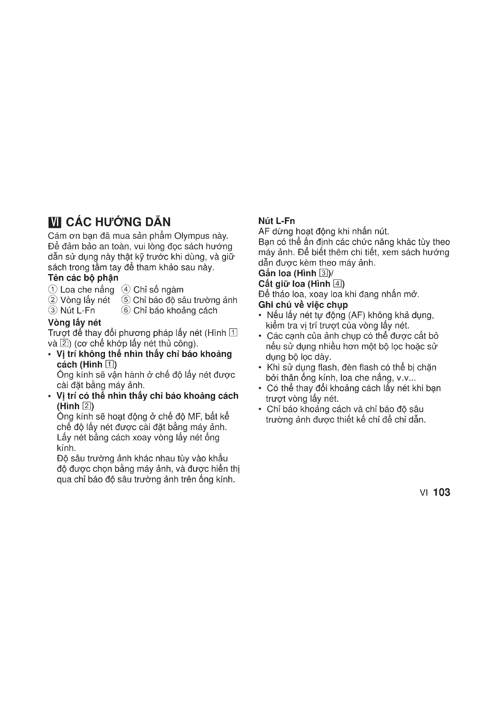 Cám ơn bạn đã mua sản phẩm Olympus này. Để đảm bảo an toàn, vui lòng đọc sách hướng dẫn sử dụng này thật kỹ trước khi dùng, và giữ sách trong tầm tay để tham khảo sau này. Tên các bộ phận 1 Loa che nắng 2 Vòng lấy nét 3 Nút L-Fn 4 Chỉ số ngàm