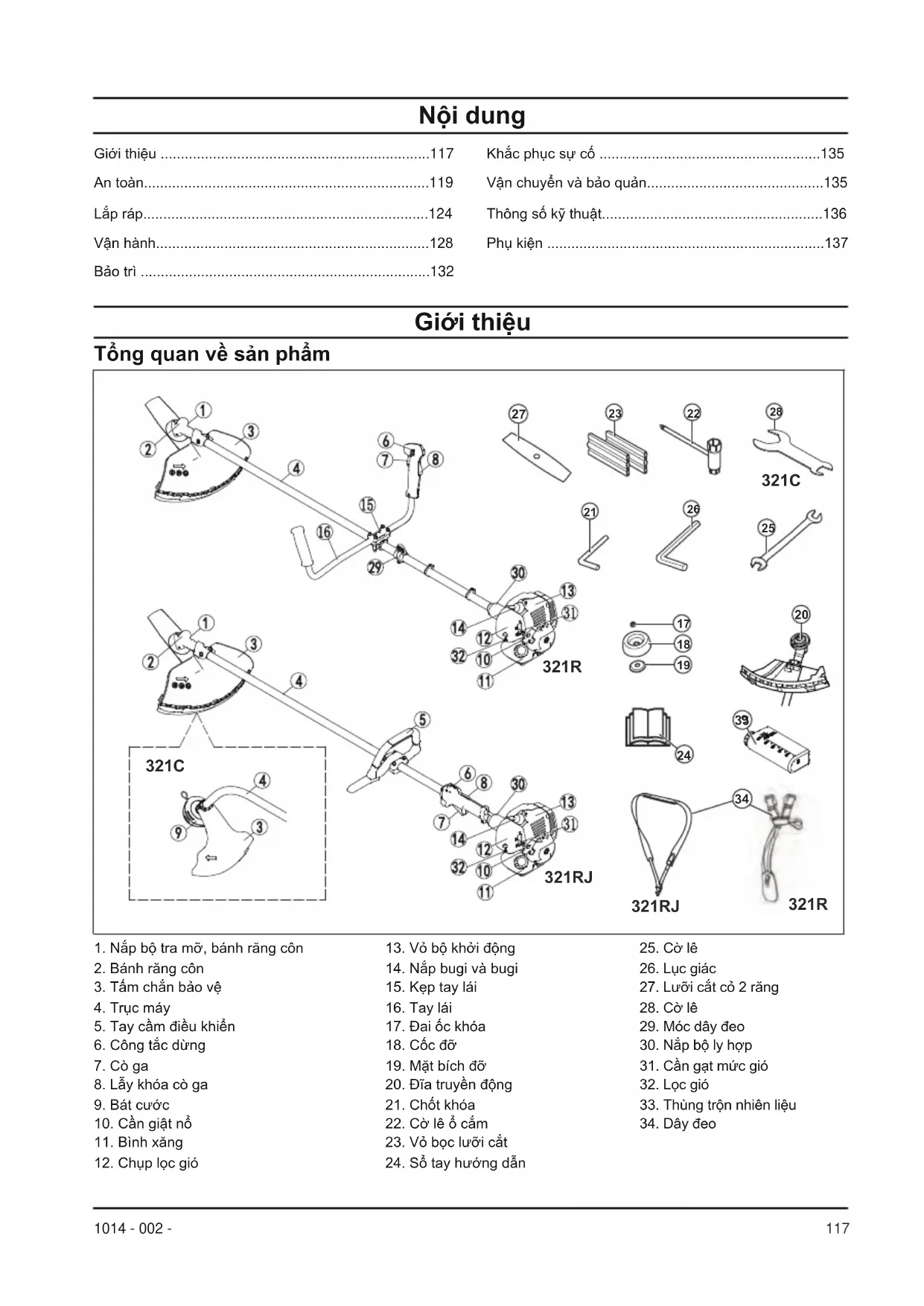 - Buộc chặt máy trong quá trình vận chuyển. 1351014 - 002 - Thông số kỹ thuật Đơn vị tính 321C 321RJ Thông số động cơ Dữ liệu về tiếng ồn và độ rung Kích thước sản phẩm Dung tích xi lanh cm