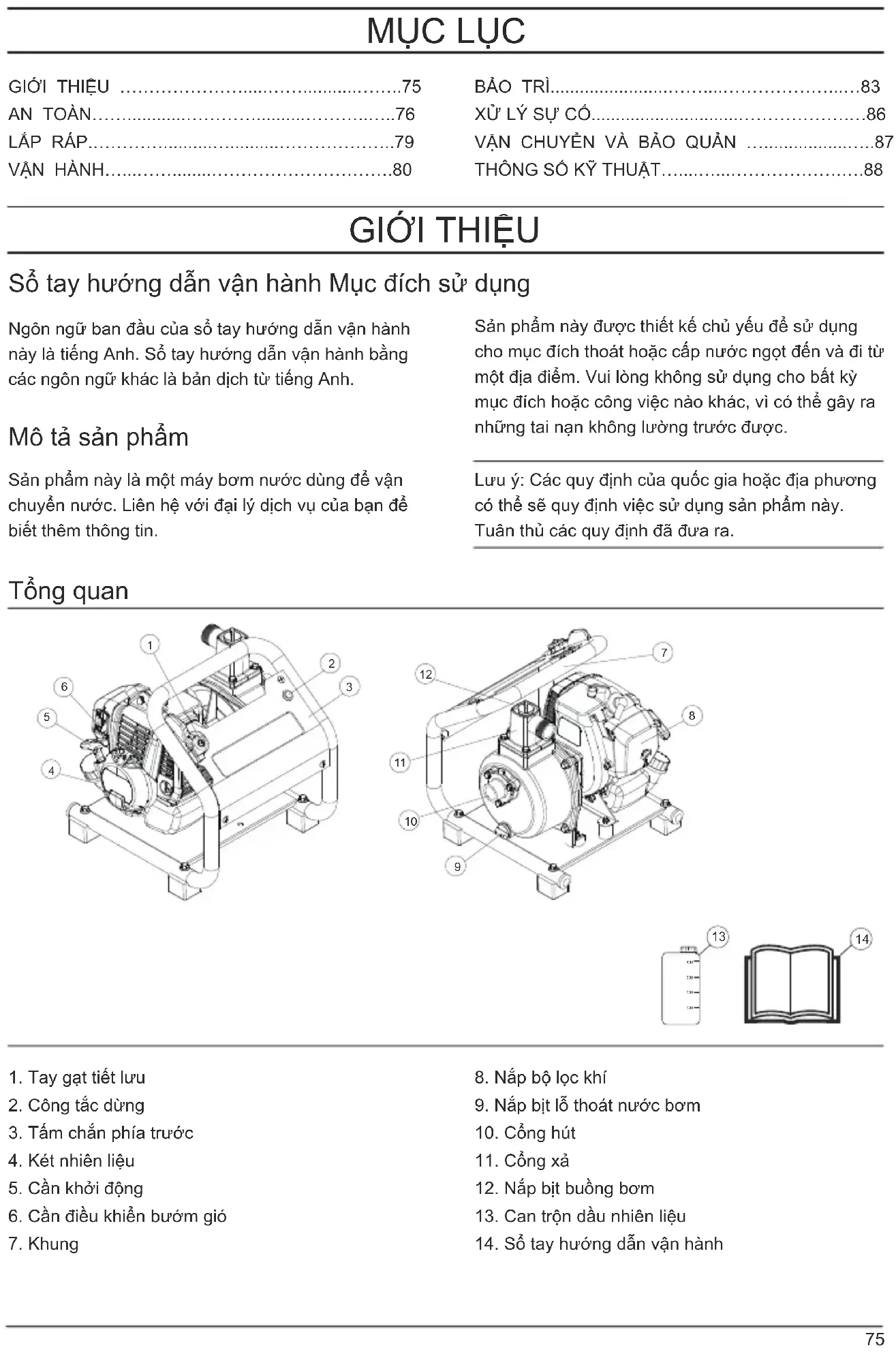 Sổ tay hướng dẫn vận hành Mục đích sử dụng Mô tả sản phẩm Tổng quan Ngôn ngữ ban đầu của sổ tay hướng dẫn vận hành này là tiếng Anh. Sổ tay hướng dẫn vận hành bằng các ngôn ngữ khác là bản dịch từ tiếng Anh. Sản phẩm này được thiết kế chủ yếu để sử dụng cho mục đích thoát hoặc cấp nước ngọt đến và đi từ một địa điểm. Vui lòng không sử dụng cho bất kỳ mục đích hoặc công việc nào khác, vì có thể gây ra những tai nạn không lường trước được. Sản phẩm này là một máy bơm nước dùng để vận chuyển nước. Liên hệ với đại lý dịch vụ của bạn để biết thêm thông tin. Lưu ý: Các quy định của quốc gia hoặc địa phương có thể sẽ quy định việc sử dụng sản phẩm này. Tuân thủ các quy định đã đưa ra.