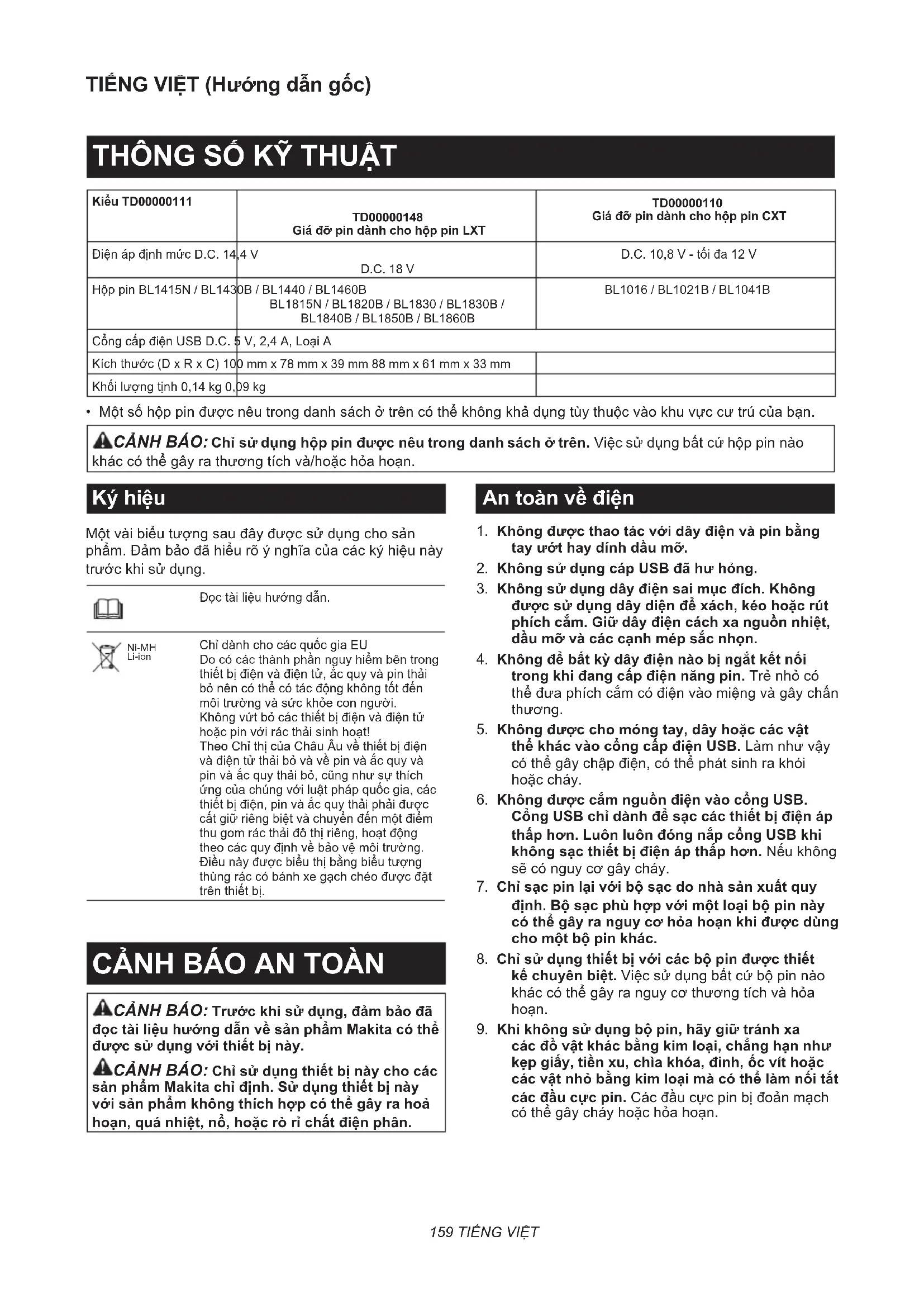 - Một số hộp pin được nêu trong danh sách ở trên có thể không khả dụng tùy thuộc vào khu vực cư trú của bạn. CẢNH BÁO: Chỉ sử dụng hộp pin được nêu trong danh sách ở trên. Việc sử dụng bất cứ hộp pin nào khác có thể gây ra thương tích và/hoặc hỏa hoạn. Ký hiệu Một vài biểu tượng sau đây được sử dụng cho sản phẩm. Đảm bảo đã hiểu rõ ý nghĩa của các ký hiệu này trước khi sử dụng. Đọc tài liệu hướng dẫn. Ni-MH Li-ion Chỉ dành cho các quốc gia EU Do có các thành phần nguy hiểm bên trong thiết bị điện và điện tử, ắc quy và pin thải bỏ nên có thể có tác động không tốt đến môi trường và sức khỏe con người. Không vứt bỏ các thiết bị điện và điện tử hoặc pin với rác thải sinh hoạt! Theo Chỉ thị của Châu Âu về thiết bị điện và điện tử thải bỏ và về pin và ắc quy và pin và ắc quy thải bỏ, cũng như sự thích ứng của chúng với luật pháp quốc gia, các thiết bị điện, pin và ắc quy thải phải được cất giữ riêng biệt và chuyển đến một điểm thu gom rác thải đô thị riêng, hoạt động theo các quy định về bảo vệ môi trường. Điều này được biểu thị bằng biểu tượng thùng rác có bánh xe gạch chéo được đặt trên thiết bị. CẢNH BÁO AN TOÀN CẢNH BÁO: Trước khi sử dụng, đảm bảo đã đọc tài liệu hướng dẫn về sản phẩm Makita có thể được sử dụng với thiết bị này. CẢNH BÁO: Chỉ sử dụng thiết bị này cho các sản phẩm Makita chỉ định. Sử dụng thiết bị này với sản phẩm không thích hợp có thể gây ra hoả hoạn, quá nhiệt, nổ, hoặc rò rỉ chất điện phân. An toàn về điện