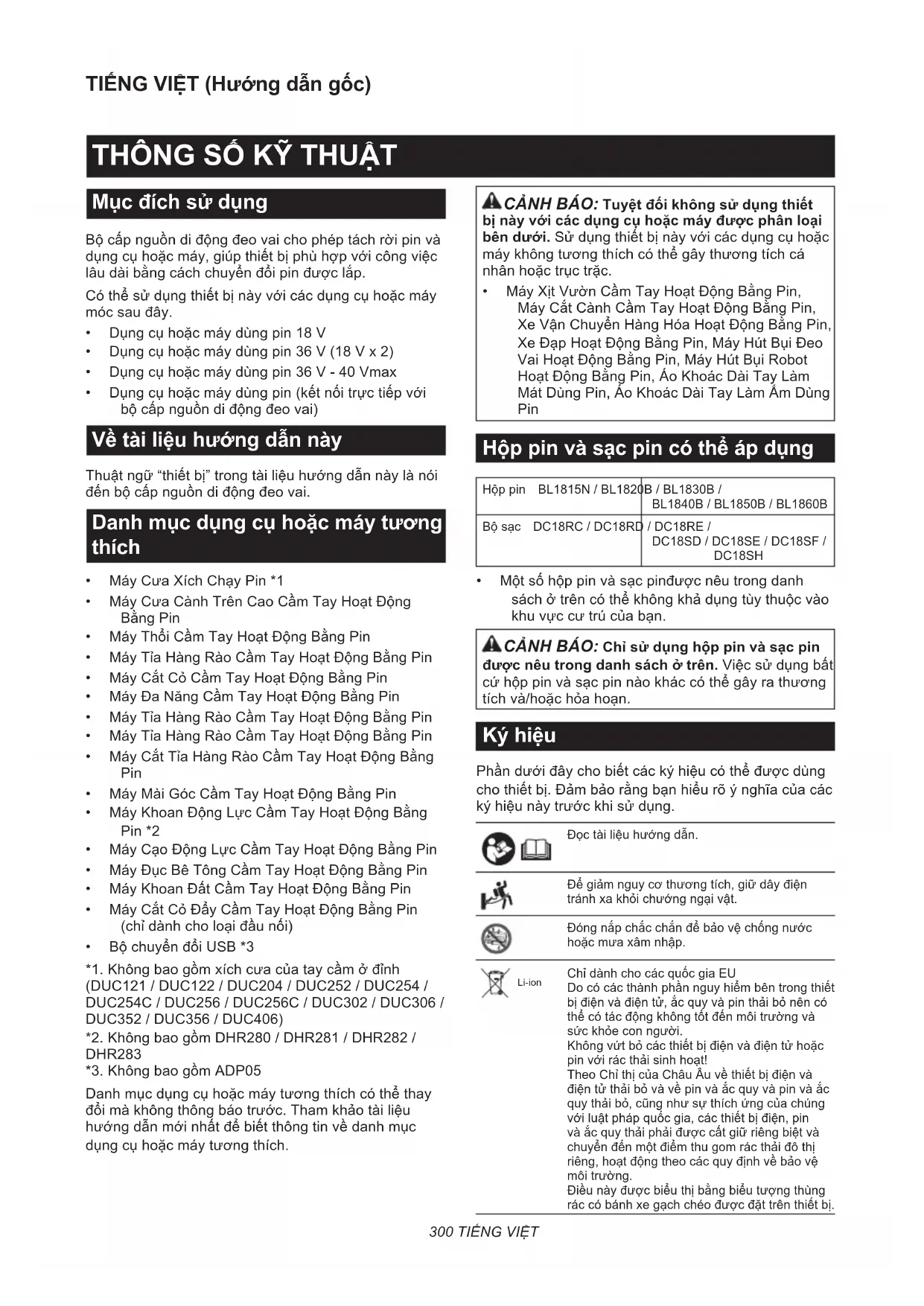 - Mộtsốhộppinvàsạcpinđượcnêutrongdanh sáchởtrêncóthểkhôngkhảdụngtùythuộcvào khuvựccưtrúcủabạn. CẢNH BÁO: Chỉ sử dụng hộp pin và sạc pin được nêu trong danh sách ở trên.Việcsửdụngbất cứhộppinvàsạcpinnàokháccóthểgâyrathương tíchvà/hoặchỏahoạn. Ký hiệu Phầndướiđâychobiếtcáckýhiệucóthểđượcdùng chothiếtbị.Đảmbảorằngbạnhiểurõýnghĩacủacác kýhiệunàytrướckhisửdụng. Đọctàiliệuhướngdẫn. Đểgiảmnguycơthươngtích,giữdâyđiện tránhxakhỏichướngngạivật. Đóngnắpchắcchắnđểbảovệchốngnước hoặcmưaxâmnhập. Li-ion ChỉdànhchocácquốcgiaEU Docócácthànhphầnnguyhiểmbêntrongthiết bịđiệnvàđiệntử,ắcquyvàpinthảibỏnêncó thểcótácđộngkhôngtốtđếnmôitrườngvà sứckhỏeconngười. Khôngvứtbỏcácthiếtbịđiệnvàđiệntửhoặc pinvớirácthảisinhhoạt! TheoChỉthịcủaChâuÂuvềthiếtbịđiệnvà điệntửthảibỏvàvềpinvàắcquyvàpinvàắc quythảibỏ,cũngnhưsựthíchứngcủachúng vớiluậtphápquốcgia,cácthiếtbịđiện,pin vàắcquythảiphảiđượccấtgiữriêngbiệtvà chuyểnđếnmộtđiểmthugomrácthảiđôthị riêng,hoạtđộngtheocácquyđịnhvềbảovệ môitrường. Điềunàyđượcbiểuthịbằngbiểutượngthùng ráccóbánhxegạchchéođượcđặttrênthiếtbị.301 TIẾNG VIỆT CẢNH BÁO AN TOÀN Cảnh báo an toàn dành cho bộ cấp nguồn di động đeo vai