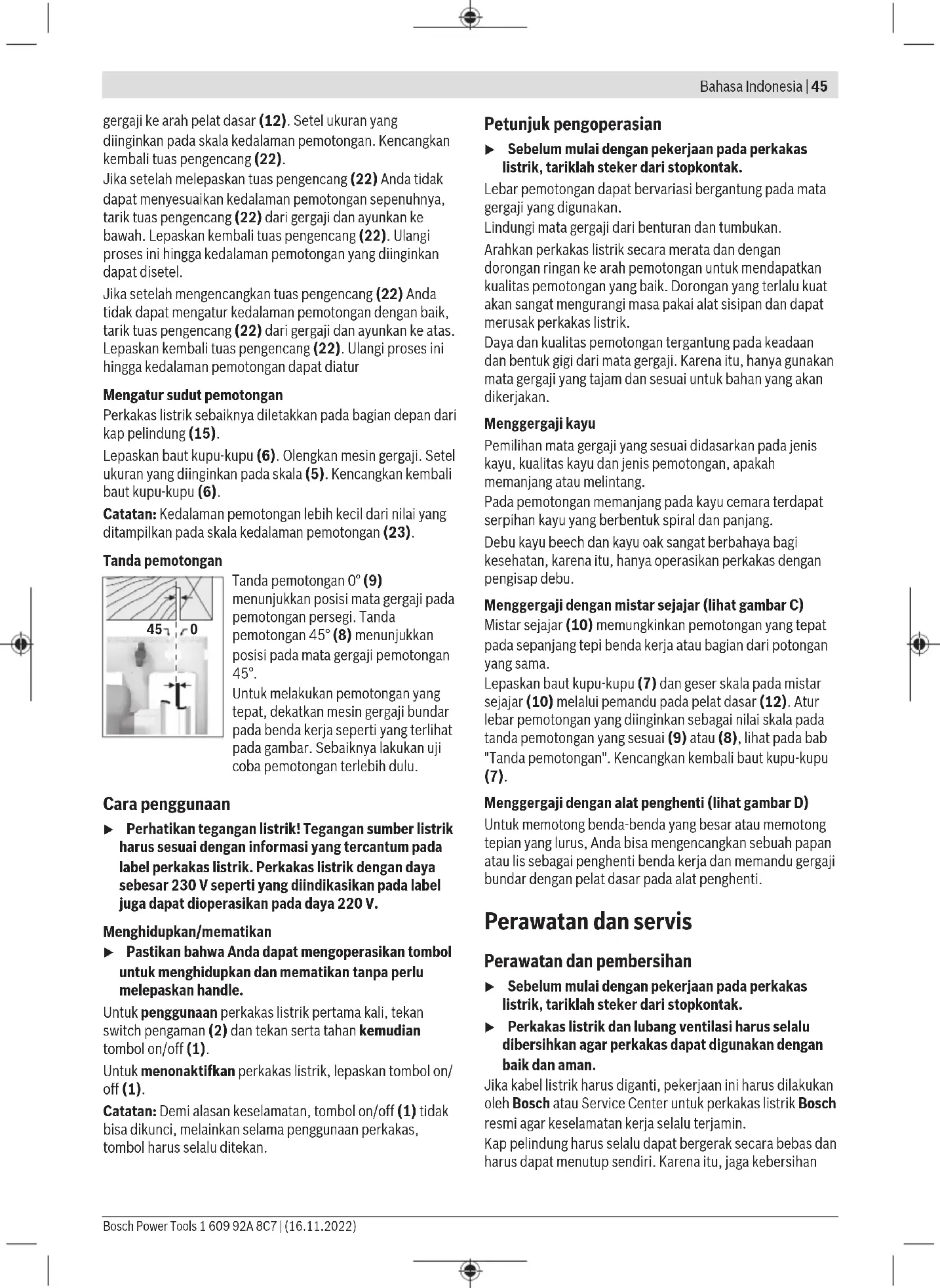 Dấu cắt 0° (9) hiển thị vị trí của lưỡi cưa ở vết cắt vuông góc. Dấu cắt 45° (8) hiển thị vị trí của lưỡi cưa ở vết cắt 45°. Để cắt chính xác, chỉnh đặt máy cưa dĩa tựa vào vật gia công như đã được trình bày trong hình. Tốt nhất là nên thực hiện việc cắt thử trước. Bắt Đầu Vận Hành u Hãy cẩn thận với nguồn điện! Điện thế của nguồn điện cung cấp phải tương ứng với số liệu ghi trên nhãn loại máy của thiết bị điện. Dụng cụ điện được ghi 230 V cũng có thể được vận hành ở 220 V. Bật Mở và Tắt u Hãy đảm bảo rằng, bạn có thể nhấn Công tắc bật/tắt, mà không cần nhả tay nắm. Để vận hành thử dụng cụ điện hãy nhấn khóa an toàn (2) và sau đó nhấn công tắc tắt/mở và nhấn giữ (1). Để tắt máy, nhả công tắc Tắt/Mở (1) ra. Hướng dẫn: Vì lý do an toàn, công tắc chuyển mạch Tắt/Mở (1) không thể khóa tự chạy được, mà phải giữ nhấn trong suốt quá trình vận hành. Hướng Dẫn Sử Dụng u Trước khi tiến hành bất cứ việc gì trên máy, kéo phích cắm điện nguồn ra. Độ rộng cắt biến đổi tùy theo lưỡi cưa được dùng. Bảo vệ lưỡi cưa không bị va đập và đụng chạm mạnh. Đẩy máy đều tay và cho nạp tải vừa phải đi theo chiều cắt để duy trì chất lượng cắt tốt. Sự nạp tải quá mức làm giảm đáng kể tuổi thọ của dụng cụ cắt và có thể làm hư hỏng máy. Hiệu suất cưa và chất lượng của sự cưa cắt tùy thuộc chủ yếu vào điều kiện, kiểu dáng răng của lưỡi cưa. Vì vậy, chỉ nên sử dụng các lưỡi cưa bén, thích hợp với loại vật liệu được gia công. Cưa Gỗ Sự lựa chọn đúng loại lưỡi cưa dựa trên loại và chất lượng gỗ và cách cắt theo yêu cầu, cắt theo chiều dọc hay chiều chéo góc. Khi xẻ dọc gỗ cây vân sam, dăm bào được tạo ra thường xoắn dài. Bụi gỗ sồi và bụi gỗ dẻ gai đặc biệt gây hại cho sức khỏe, do đó chỉ làm việc với thiết bị hút bụi. Cưa với thanh cữ (xem hình C) Thanh cữ (10) cho phép cắt chính xác dọc theo cạnh phôi gia công hoặc cắt các dải cùng kích thước. Hãy nhả bu‑long tai hồng (7) và đẩy thước đo của thanh cữ (10) qua đường dẫn vào chân đế khuôn bao (12). Hãy đặt chiều rộng cắt mong muốn dưới dạng giá trị thang đo ở vạch cắt tương ứng (9) hoặc (8), xem phần „Các vạch cắt“. Hãy vặn chặt lại bu‑long tai hồng (7). Cưa với dưỡng phụ (xem hình D) Để cưa vật gia công rộng bản hoặc có cạnh thẳng, dùng ván hay thanh nẹp kẹp vào vật gia công như là một dưỡng phụ; có thể đẩy chân đế của cưa dĩa tựa dọc theo dưỡng phụ. Bosch Power Tools 1 609 92A 8C7 | (16.11.2022)52 | Tiếng Việt Bảo Dưỡng và Bảo Quản Bảo Dưỡng Và Làm Sạch u Trước khi tiến hành bất cứ việc gì trên máy, kéo phích cắm điện nguồn ra. u Để được an toàn và máy hoạt động đúng chức năng, luôn luôn giữ máy và các khe thông gió được sạch. Nếu như cần phải thay dây dẫn điện thì công việc này phải do hãng Bosch, hay một đại lý được Bosch ủy nhiệm thực hiện để tránh gặp sự nguy hiểm do mất an toàn. Chắn đàn hồi bảo vệ lưỡi phải luôn luôn có thể chuyển động tự do, co thụt tự động. Vì vậy, luôn luôn giữ cho phạm vi chung quanh chắn bảo vệ lưỡi đàn hồi được sạch. Làm sạch bụi và dăm bằng bàn chải. Lưỡi cưa không được phủ ngoài, có thể bảo vệ được bằng cách dùng loại dầu nhờn không axit phủ một lớp mỏng chống gỉ sét lên. Phải lau sạch dầu nhờn lại trước khi sử dụng, nếu không, sẽ làm gỗ bị bẩn. Cặn nhựa và keo dính trên lưỡi cưa tạo ra đường cắt có chất lượng tồi. Vì vậy, làm sạch lưỡi cưa ngay sau mỗi lần sử dụng. Dịch vụ hỗ trợ khách hàng và tư vấn sử dụng Bộ phận phục vụ hàng sau khi bán của chúng tôi trả lời các câu hỏi liên quan đến việc bảo dưỡng và sửa chữa các sản phẩm cũng như phụ tùng thay thế của bạn. Sơ đồ mô tả và thông tin về phụ tùng thay thế cũng có thể tra cứu theo dưới đây: www.bosch-pt.com Đội ngũ tư vấn sử dụng của Bosch sẽ giúp bạn giải đáp các thắc mắc về sản phẩm và phụ kiện. Trong tất cả các phản hồi và đơn đặt phụ tùng, xin vui lòng luôn luôn nhập số hàng hóa 10 chữ số theo nhãn của hàng hóa. Việt Nam CN CÔNG TY TNHH BOSCH VIÊT NAM TAI TP.HCM Tâng 14, Ngôi Nhà Đức, 33 Lê Duẩn Phương Bến Nghé, Quân 1, Thanh Phô Hô Chi Minh Tel.: (028) 6258 3690 Fax: (028) 6258 3692 - 6258 3694 Hotline: (028) 6250 8555 Email: tuvankhachhang-pt@vn.bosch.com www.bosch-pt.com.vn www.baohanhbosch-pt.com.vn Xem thêm địa chỉ dịch vụ tại: www.bosch-pt.com/serviceaddresses Sự thải bỏ Máy, linh kiện và bao bì phải được phân loại để tái chế theo hướng thân thiện với môi trường. Không được thải bỏ dụng cụ điện vào chung với rác sinh hoạt! 1 609 92A 8C7 | (16.11.2022) Bosch Power Toolsيبرع | 53