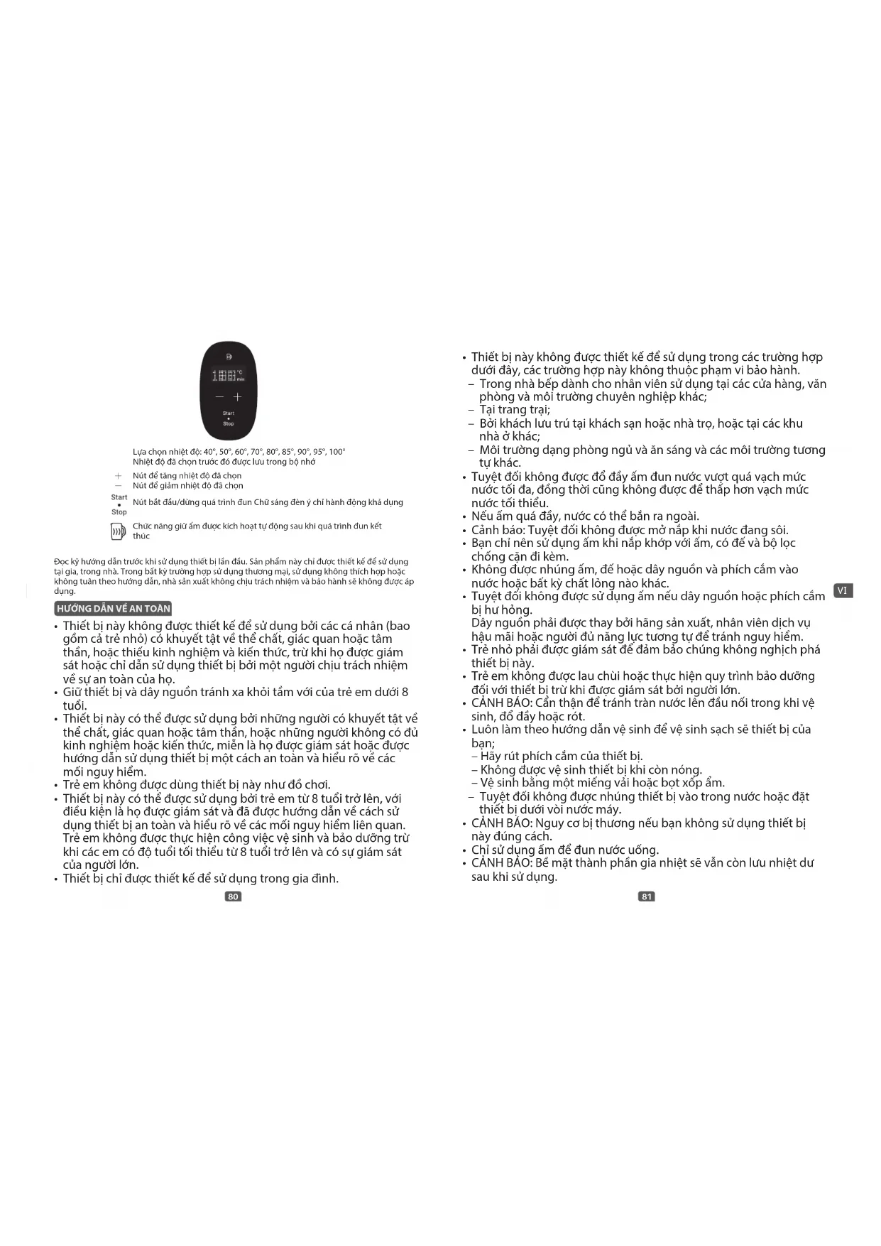 Lựa chọn nhiệt độ: 40°, 50°, 60°, 70°, 80°, 85°, 90°, 95°, 100° Nhiệt độ đã chọn trước đó được lưu trong bộ nhớ Nút để tăng nhiệt độ đã chọn Nút để giảm nhiệt độ đã chọn Nút bắt đầu/dừng quá trình đun Chữ sáng đèn ý chỉ hành động khả dụng Chức năng giữ ấm được kích hoạt tự động sau khi quá trình đun kết thúc8382