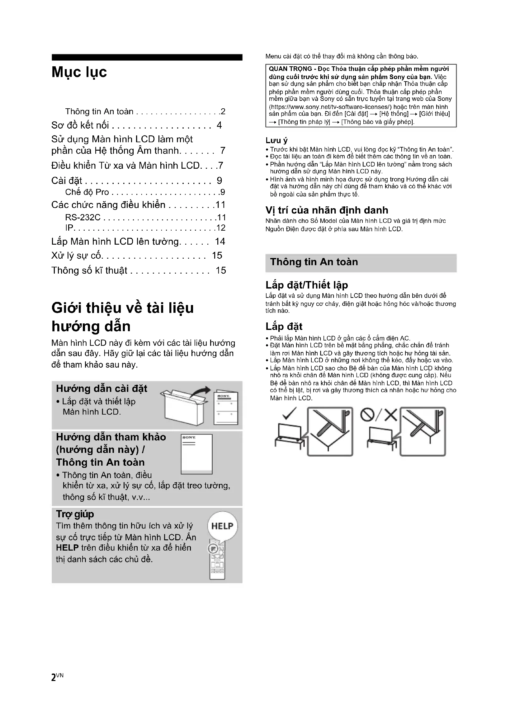 - Phải lắp Màn hình LCD ở gần các ổ cắm điện AC.• Đặt Màn hình LCD trên bề mặt bằng phẳng, chắc chắn để tránh làm rơi Màn hình LCD và gây thương tích hoặc hư hỏng tài sản.• Lắp Màn hình LCD ở những nơi không thể kéo, đẩy hoặc va vào.• Lắp Màn hình LCD sao cho Bệ để bàn của Màn hình LCD không nhô ra khỏi chân đế Màn hình LCD (không được cung cấp). Nếu Bệ để bàn nhô ra khỏi chân đế Màn hình LCD, thì Màn hình LCD có thể bị lật, bị rơi và gây thương thích cá nhân hoặc hư hỏng cho Màn hình LCD. Giới thiệu về tài liệu hướng dẫn Màn hình LCD này đi kèm với các tài liệu hướng dẫn sau đây. Hãy giữ lại các tài liệu hướng dẫn để tham khảo sau này. Hướng dẫn cài đặt