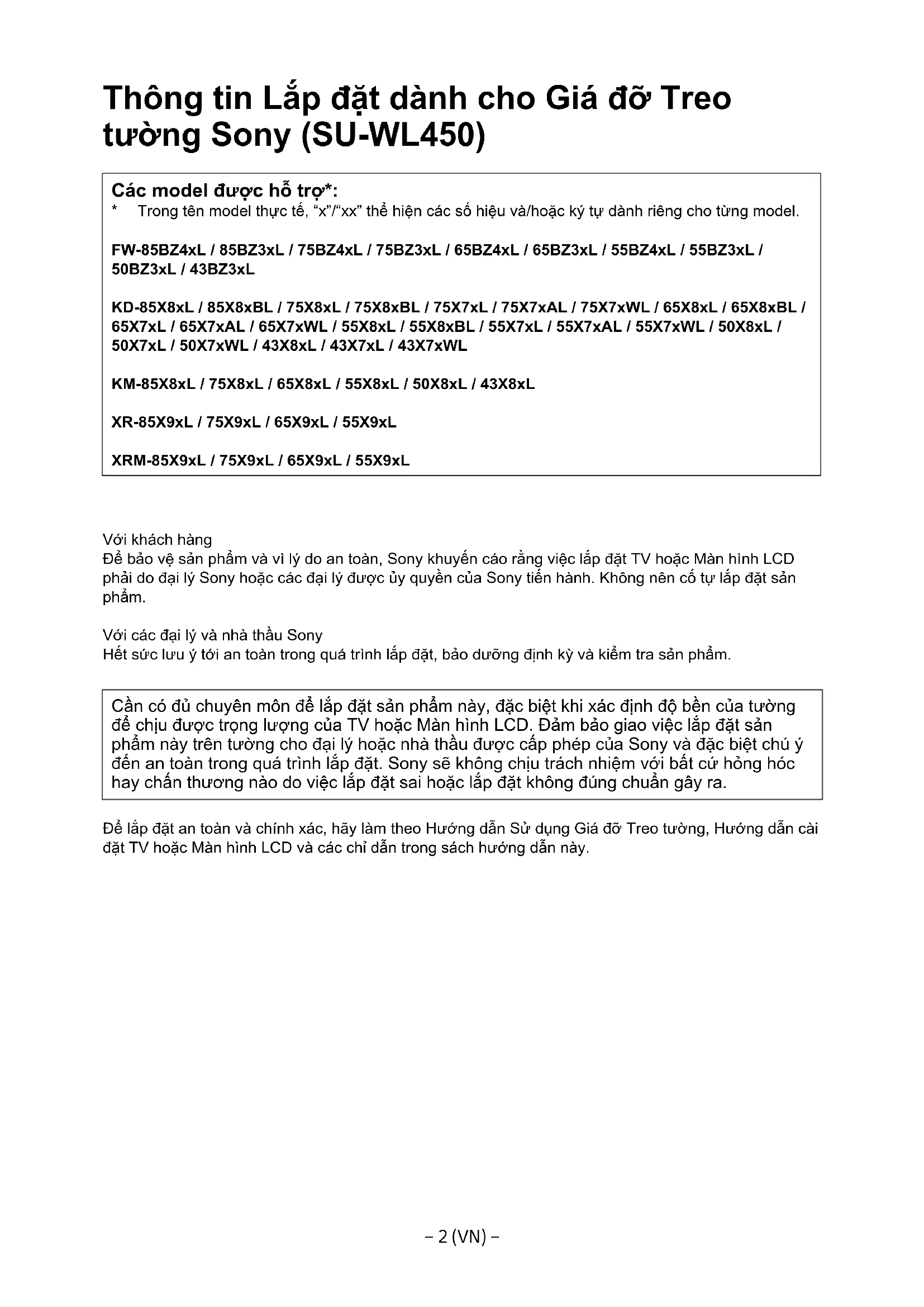 - Trongtênmodelthựctế,“x”/“xx”thểhiệncácsốhiệuvà/hoặckýtựdànhriêngchotừngmodel. FW-85BZ4xL / 85BZ3xL / 75BZ4xL / 75BZ3xL / 65BZ4xL / 65BZ3xL / 55BZ4xL / 55BZ3xL / 50BZ3xL / 43BZ3xL KD-85X8xL / 85X8xBL / 75X8xL / 75X8xBL / 75X7xL / 75X7xAL / 75X7xWL / 65X8xL / 65X8xBL / 65X7xL / 65X7xAL / 65X7xWL / 55X8xL / 55X8xBL / 55X7xL / 55X7xAL / 55X7xWL / 50X8xL / 50X7xL / 50X7xWL / 43X8xL / 43X7xL / 43X7xWL KM-85X8xL / 75X8xL / 65X8xL / 55X8xL / 50X8xL / 43X8xL XR-85X9xL / 75X9xL / 65X9xL / 55X9xL XRM-85X9xL / 75X9xL / 65X9xL / 55X9xL Vớikháchhàng Đểbảovệsảnphẩmvàvìlýdoantoàn,SonykhuyếncáorằngviệclắpđặtTVhoặcMànhìnhLCD phảidođạilýSonyhoặccácđạilýđượcủyquyềncủaSonytiếnhành.Khôngnêncốtựlắpđặtsản phẩm. VớicácđạilývànhàthầuSony Hếtsứclưuýtớiantoàntrongquátrìnhlắpđặt,bảodưỡngđịnhkỳvàkiểmtrasảnphẩm. Cầncóđủchuyênmônđểlắpđặtsảnphẩmnày,đặcbiệtkhixácđịnhđộbềncủatường đểchịuđượctrọnglượngcủaTVhoặcMànhìnhLCD.Đảmbảogiaoviệclắpđặtsản phẩmnàytrêntườngchođạilýhoặcnhàthầuđượccấpphépcủaSonyvàđặcbiệtchúý đếnantoàntrongquátrìnhlắpđặt.Sonysẽkhôngchịutráchnhiệmvớibấtcứhỏnghóc haychấnthươngnàodoviệclắpđặtsaihoặclắpđặtkhôngđúngchuẩngâyra. Đểlắpđặtantoànvàchínhxác,hãylàmtheoHướngdẫnSửdụngGiáđỡTreotường,Hướngdẫncài đặtTVhoặcMànhìnhLCDvàcácchỉdẫntrongsáchhướngdẫnnày.− 3 (VN) −