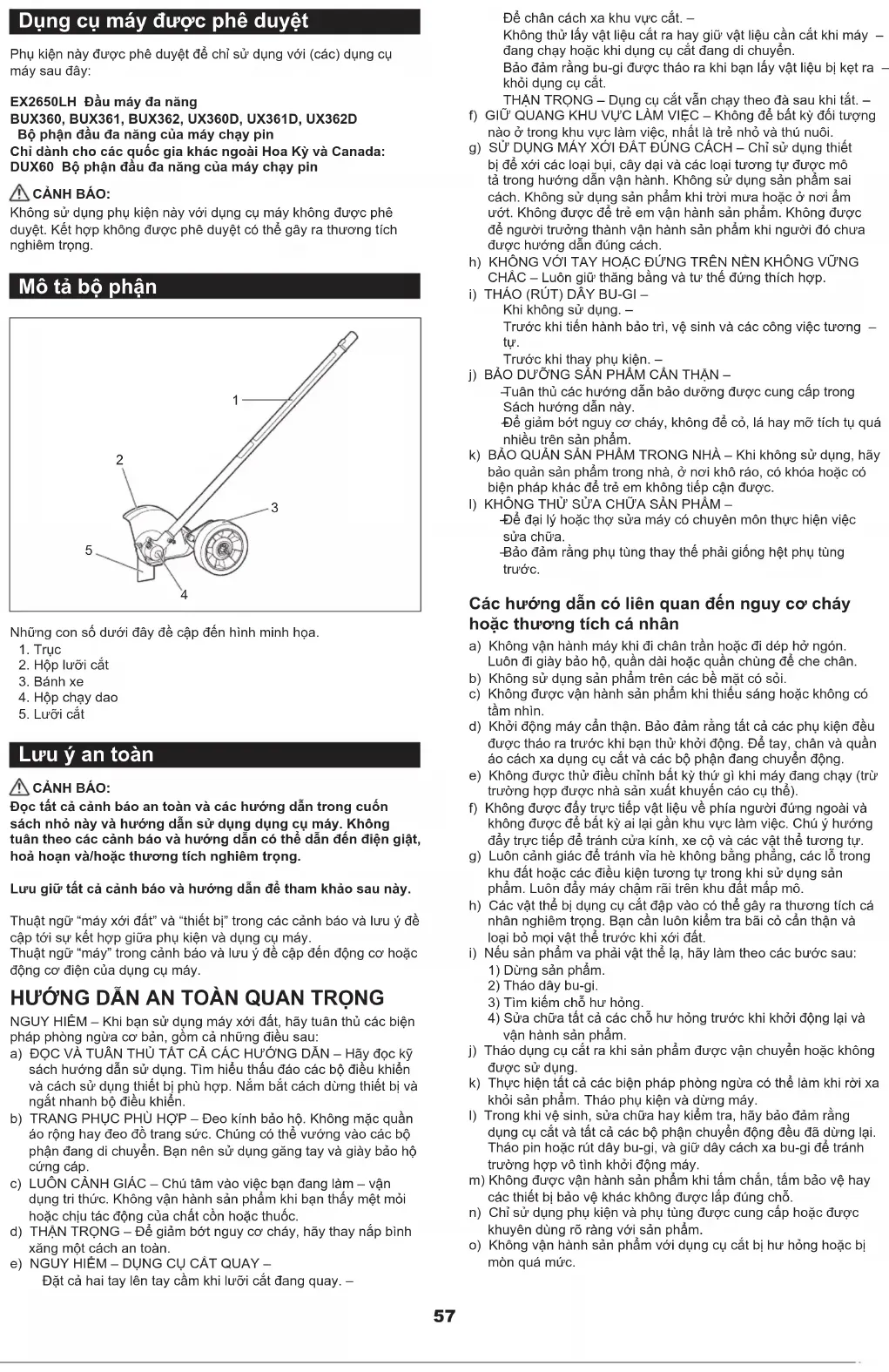 Trưc khi thay ph kin. – j) BẢO DƯỠNG SẢN PHẨM CẨN THẬN – Tuân th cc hưng dn bo dưng đưc cung cp trong – Sch hưng dn ny. Đ gim bt nguy cơ chy, không đ c, l hay m tch t qu – nhiu trên sn phm. k) BẢO QUẢN SẢN PHẨM TRONG NHÀ – Khi không s dng, hy bo qun sn phm trong nh, nơi khô ro, c kha hoc c bin php khc đ trẻ em không tip cn đưc. l) KHÔNG THỬ SỬA CHỮA SẢN PHẨM – Đ đi l hoc th sa my c chuyên môn thc hin vic – sa cha. Bo đm rằng ph tùng thay th phi ging ht ph tùng – trưc. Các hưng dn có liên quan đn nguy cơ cháy hoc thương tích cá nhân a) Không vn hnh my khi đi chân trn hoc đi dép h ngn. Luôn đi giy bo h, qun di hoc qun chùng đ che chân. b) Không s dng sn phm trên cc b mt c si. c) Không đưc vn hnh sn phm khi thiu sng hoc không c tm nhn. d) Khi đng my cn thn. Bo đm rằng tt c cc ph kin đu đưc tho ra trưc khi bn th khi đng. Đ tay, chân v qun o cch xa dng c ct v cc b phn đang chuyn đng. e) Không đưc th điu chnh bt kỳ th g khi my đang chy (tr trưng hp đưc nh sn xut khuyn co c th). f) Không đưc đy trc tip vt liu v pha ngưi đng ngoi v không đưc đ bt kỳ ai li gn khu vc lm vic. Chú hưng đy trc tip đ trnh ca knh, xe c v cc vt th tương t. g) Luôn cnh gic đ trnh va hè không bằng phẳng, cc lỗ trong khu đt hoc cc điu kin tương t trong khi s dng sn phm. Luôn đy my chm ri trên khu đt mp mô. h) Cc vt th b dng c ct đp vo c th gây ra thương tch c nhân nghiêm trng. Bn cn luôn kim tra bi c cn thn v loi b mi vt th trưc khi xi đt.