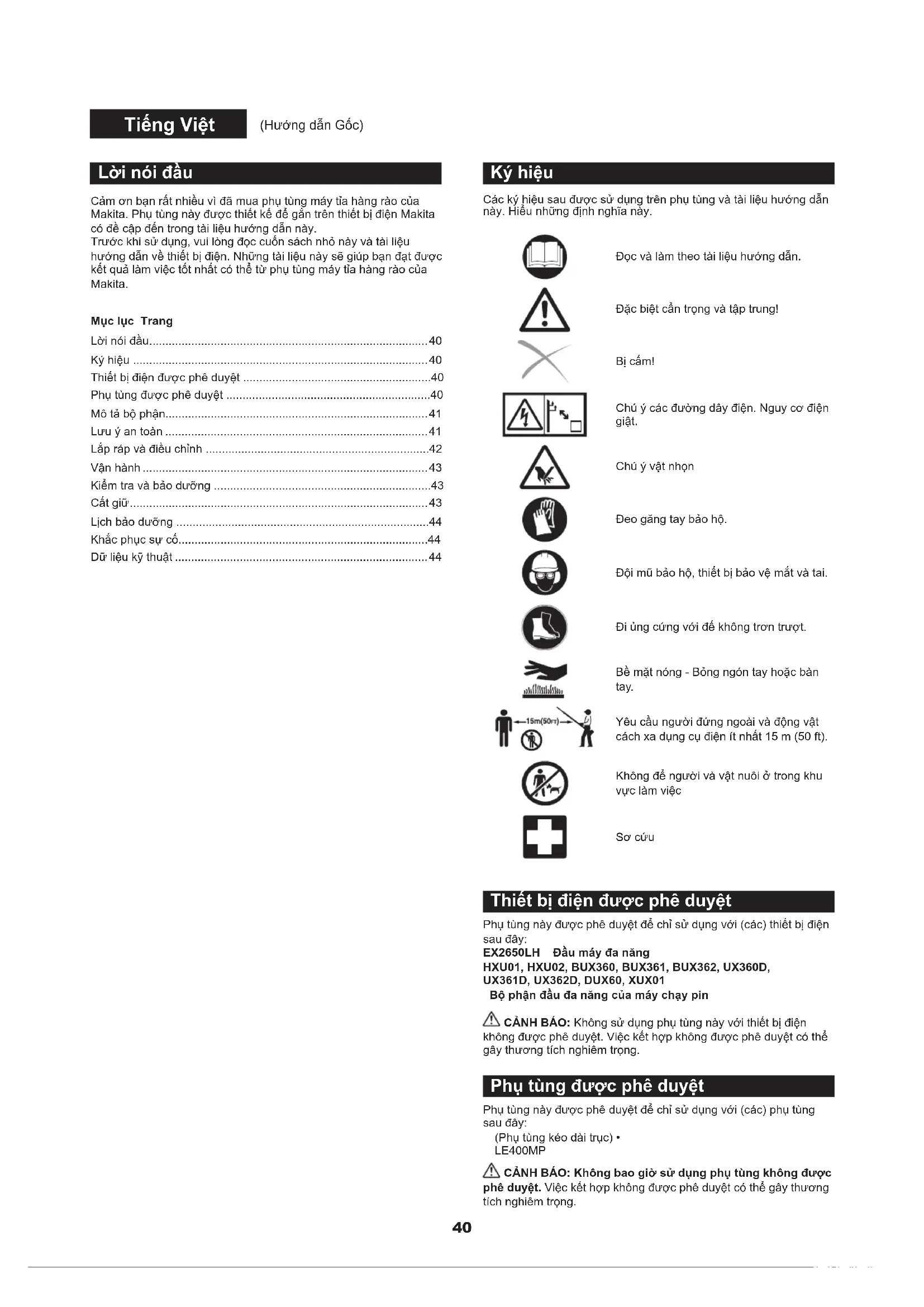 Thit b đin Tham kho ti liu hưng dn v thit b đin Khc phc s c S c Nguyên nhân có th Gii php My không khi đng. Tham kho ti liu hưng dn v thit b đin. My dng ngay sau khi khi đng. Tc đ ti đa b gii hn. Lưi ct không di chuyn. Dng my ngay lập tc! Gc ca my ct không ph hp. Đm bo kho gc đt đúng cch. Cnh con b kt vo lưi ct. G b vt l. H thng dn đng không hot đng đúng cch. Yêu cu trung tâm dch v đưc u quyn ca Makita kim tra v sa cha. My rung bt thưng. Dng my ngay lập tc! H thng dn đng không hot đng đúng cch. Yêu cu trung tâm dch v đưc u quyn ca Makita kim tra v sa cha. Lưi ct không dng đưc. Dng my ngay lập tc! Thit b đin không hot đng đúng cch. Tham kho ti liu hưng dn v thit b đin. D liu k thuật Kiu my EN401MP Kch thưc (D x R x C) mm (inch) 1.624 x 108 x 90 (64” x 4-1/4” x 3-1/2”) Khi lưng kg (lbs) 2,8 (6,3) Đ rng ct hiu dng mm (inch) 490 (19-1/4”) Gc lưi ct 135° (lên 45°, xung 90°) T s truyn 1/4,7845