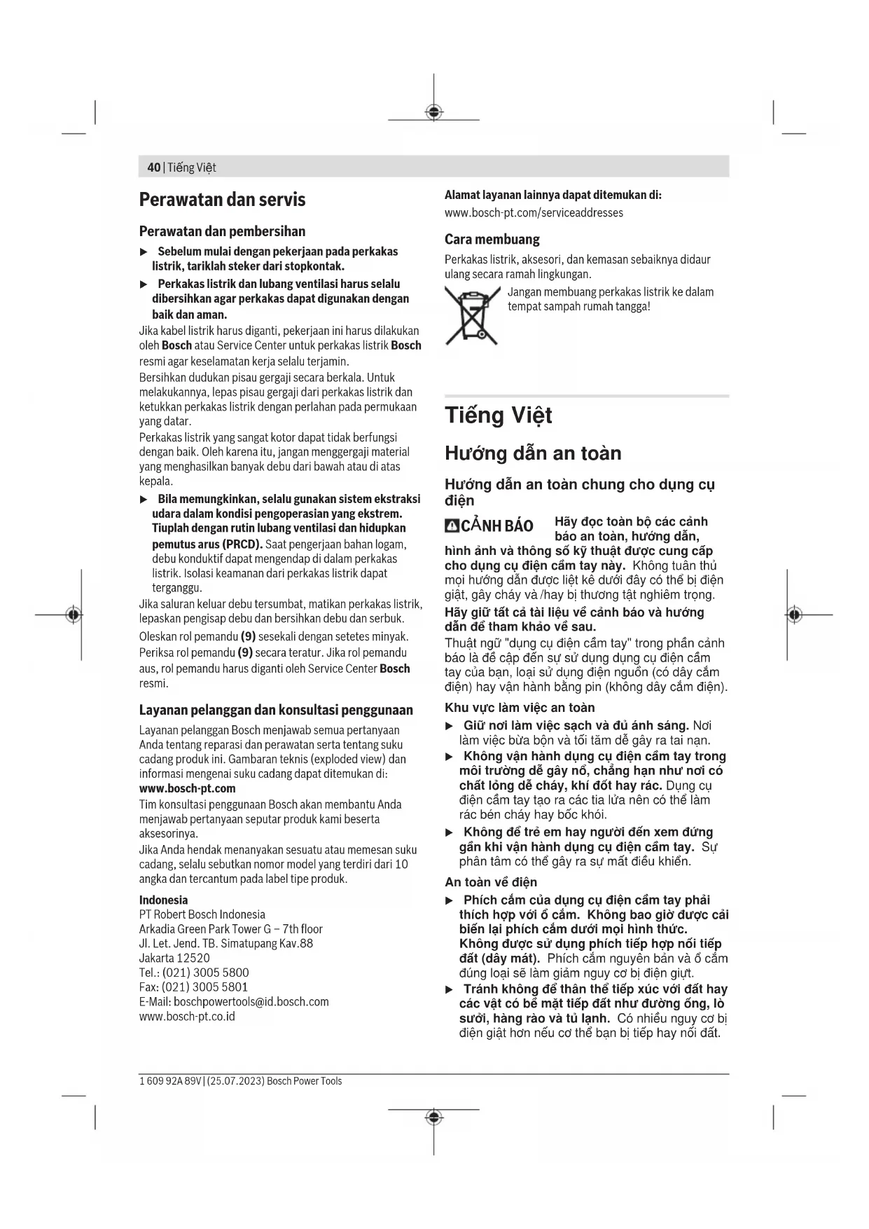 Hãy đọc toàn bộ các cảnh báo an toàn, hướng dẫn, hình ảnh và thông số kỹ thuật được cung cấp cho dụng cụ điện cầm tay này. Không tuân thủ mọi hướng dẫn được liệt kê dưới đây có thể bị điện giật, gây cháy và /hay bị thương tật nghiêm trọng. Hãy giữ tất cả tài liệu về cảnh báo và hướng dẫn để tham khảo về sau. Thuật ngữ "dụng cụ điện cầm tay" trong phần cảnh báo là đề cập đến sự sử dụng dụng cụ điện cầm tay của bạn, loại sử dụng điện nguồn (có dây cắm điện) hay vận hành bằng pin (không dây cắm điện). Khu vực làm việc an toàn u Giữ nơi làm việc sạch và đủ ánh sáng. Nơi làm việc bừa bộn và tối tăm dễ gây ra tai nạn. u Không vận hành dụng cụ điện cầm tay trong môi trường dễ gây nổ, chẳng hạn như nơi có chất lỏng dễ cháy, khí đốt hay rác. Dụng cụ điện cầm tay tạo ra các tia lửa nên có thể làm rác bén cháy hay bốc khói. u Không để trẻ em hay người đến xem đứng gần khi vận hành dụng cụ điện cầm tay. Sự phân tâm có thể gây ra sự mất điều khiển. An toàn về điện u Phích cắm của dụng cụ điện cầm tay phải thích hợp với ổ cắm. Không bao giờ được cải biến lại phích cắm dưới mọi hình thức. Không được sử dụng phích tiếp hợp nối tiếp đất (dây mát). Phích cắm nguyên bản và ổ cắm đúng loại sẽ làm giảm nguy cơ bị điện giựt. u Tránh không để thân thể tiếp xúc với đất hay các vật có bề mặt tiếp đất như đường ống, lò sưởi, hàng rào và tủ lạnh. Có nhiều nguy cơ bị điện giật hơn nếu cơ thể bạn bị tiếp hay nối đất. 1 609 92A 89V | (25.07.2023) Bosch Power ToolsTiếng Việt | 41 u Không được để dụng cụ điện cầm tay ngoài mưa hay ở tình trạng ẩm ướt. Nước vào máy sẽ làm tăng nguy cơ bị điện giật. u Không được lạm dụng dây dẫn điện. Không bao giờ được nắm dây dẫn để xách, kéo hay rút phích cắm dụng cụ điện cầm tay. Không để dây gần nơi có nhiệt độ cao, dầu nhớt, vật nhọn bén và bộ phận chuyển động. Làm hỏng hay cuộn rối dây dẫn làm tăng nguy cơ bị điện giật. u Khi sử dụng dụng cụ điện cầm tay ngoài trời, dùng dây nối thích hợp cho việc sử dụng ngoài trời. Sử dụng dây nối thích hợp cho việc sử dụng ngoài trời làm giảm nguy cơ bị điện giật. u Nếu việc sử dụng dụng cụ điện cầm tay ở nơi ẩm ướt là không thể tránh được, dùng thiết bị ngắt mạch tự động (RCD) bảo vệ nguồn. Sử dụng thiết bị ngắt mạch tự động RCD làm giảm nguy cơ bị điện giựt. An toàn cá nhân u Hãy tỉnh táo, biết rõ mình đang làm gì và hãy sử dụng ý thức khi vận hành dụng cụ điện cầm tay. Không sử dụng dụng cụ điện cầm tay khi đang mệt mỏi hay đang bị tác động do chất gây nghiện, rượu hay dược phẩm gây ra. Một thoáng mất tập trung khi đang vận hành dụng cụ điện cầm tay có thể gây thương tích nghiêm trọng cho bản thân. u Sử dụng trang bị bảo hộ cá nhân. Luôn luôn đeo kính bảo vệ mắt. Trang bị bảo hộ như khẩu trang, giày chống trợt, nón bảo hộ, hay dụng cụ bảo vệ tai khi được sử dụng đúng nơi đúng chỗ sẽ làm giảm nguy cơ thương tật cho bản thân. u Phòng tránh máy khởi động bất ngờ. Bảo đảm công tắc máy ở vị trí tắt trước khi cắm vào nguồn điện và/hay lắp pin vào, khi nhấc máy lên hay khi mang xách máy. Ngáng ngón tay vào công tắc máy để xách hay kích hoạt dụng cụ điện cầm tay khi công tắc ở vị trí mở dễ dẫn đến tai nạn. u Lấy mọi chìa hay khóa điều chỉnh ra trước khi mở điện dụng cụ điện cầm tay. Khóa hay chìa còn gắn dính vào bộ phận quay của dụng cụ điện cầm tay có thể gây thương tích cho bản thân. u Không rướn người. Luôn luôn giữ tư thế đứng thích hợp và thăng bằng. Điều này tạo cho việc điều khiển dụng cụ điện cầm tay tốt hơn trong mọi tình huống bất ngờ. u Trang phục thích hợp. Không mặc quần áo rộng lùng thùng hay mang trang sức. Giữ tóc và quần áo xa khỏi các bộ phận chuyển động. Quần áo rộng lùng thùng, đồ trang sức hay tóc dài có thể bị cuốn vào các bộ phận chuyển động. u Nếu có các thiết bị đi kèm để nối máy hút bụi và các phụ kiện khác, bảo đảm các thiết bị này được nối và sử dụng tốt. Việc sử dụng các thiết bị gom hút bụi có thể làm giảm các độc hại liên quan đến bụi gây ra. u Không để thói quen do sử dụng thường xuyên dụng cụ khiến bạn trở nên chủ quan và bỏ qua các quy định an toàn dụng cụ. Một hành vi bất cẩn có thể gây ra thương tích nghiêm trọng chỉ trong tíc tắc. Sử dụng và bảo dưỡng dụng cụ điện cầm tay u Không được ép máy. Sử dụng dụng cụ điện cầm tay đúng loại theo đúng ứng dụng của bạn. Dụng cụ điện cầm tay đúng chức năng sẽ làm việc tốt và an toàn hơn theo đúng tiến độ mà máy được thiết kế. u Không sử dụng dụng cụ điện cầm tay nếu như công tắc không tắt và mở được. Bất kỳ dụng cụ điện cầm tay nào mà không th