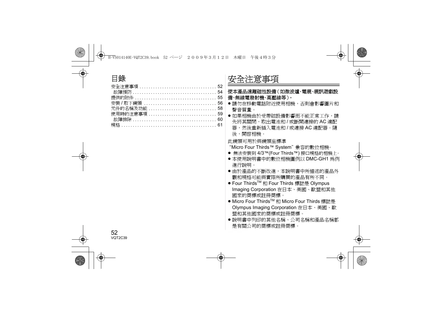 Stabilisateur optique de l’image Monture Angle de vue Diamètre de filtre Diamètre maximum Longueur totale Poids F4.0 (Grand-angle) à F5.8 (Téléobjectif) F22 17 éléments en 13 groupes (lentilles 4 asphériques, 2 Objectifs ED) 0,5 m à ¶ (à partir de la ligne de référence de mise au point) 0,2k (Équivalent à un film de 35 mm: 0,4k) Disponible “Micro Four Thirds Mount” 75x (Grand-angle) à 8,8x (Téléobjectif) 62 mm DMC-GH1 en concepto de ejemplo. ≥ E aspecto y las especificaciones de los productos descritos en este manual pueden diferir de los productos reales que usted ha comprado debido a aumentos sucesivos. ≥ El logotipo Four ThirdsTMy Four Thirds son marcas comerciales o marcas comerciales registradas de Olympus Imaging Corporation, en Japón, los Estados Unidos, la Unión Europea y otros países. ≥ El logotipo Micro Four ThirdsTMy Micro Four Thirds son marcas comerciales o marcas comerciales registradas de Olympus Imaging Corporation, en Japón, los Estados Unidos, la Unión Europea y otros países. ≥ Los demás nombres, nombres de sociedades y nombres de productos citados en estas instrucciones son marcas de fábrica o marcas registradas.