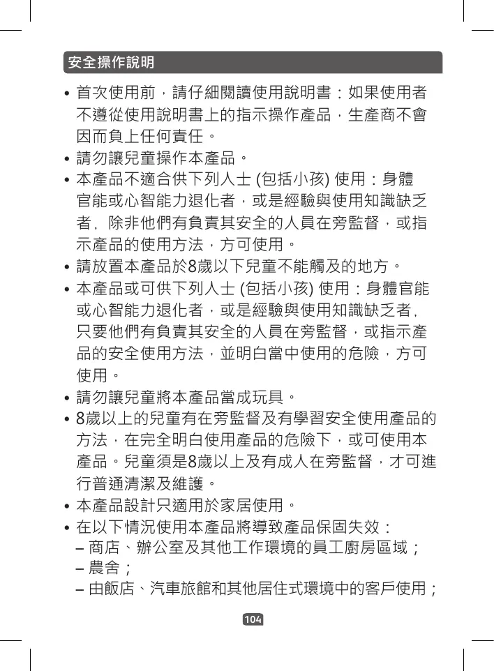 • Conserver l’appareil et son câble hors de portée des enfants âgés de moins de 8 ans. • Cet appareil peut être utilisé par des personnes dont les capacités physiques, sensorielles ou mentales sont réduites ou dont l’expérience ou les connaissances ne sont pas suffisantes, à condition qu’ils bénéficient d’une surveillance ou qu’ils aient reçu des instructions quant à l’utilisation de l’appareil 1