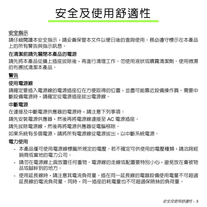 安全及使用舒適性 安全指示 請仔細閱讀本安全指示,請妥善保管本文件以便日後的查詢使用。務必遵守標示在本產品 上的所有警告與指示訊息。 在清潔前請先關閉本產品的電源 請先將本產品從牆上插座拔除後,再進行清理工作。勿使用液狀或噴霧清潔劑。使用微濕 的布擦拭清潔本產品。 警告 使用電源線 請確定要插入電源線的電源插座位在方便取得的位置,並盡可能靠近設備操作員。需要中 斷設備電源時,請確定從電源插座拔出電源線。 中斷電源 在連接及中斷電源供應器的電源時,請注意下列事項: 請先安裝電源供應器,然後再將電源線連接至 AC 電源插座。 請先拔除電源線,然後再將電源供應器從電腦移除。 如果系統有多個電源,請將所有電源線從電源拔出,以中斷系統電源。 電力使用 - 本產品僅可使用電源線標籤所規定的電壓。若不確定可供使用的電壓種類,請洽詢經 銷商或當地的電力公司。 - 請勿在電源線上面放置任何重物。電源線的走線或配置要特別小心,避免放在會被物 品或腳絆到的地方。 - 使用延長線時,請注意其電流負荷量。插在同一延長線的電器設備使用電量不可超過 延長線的電流負荷量。同時,同一插座的耗電量也不可超過保險絲的負荷量。