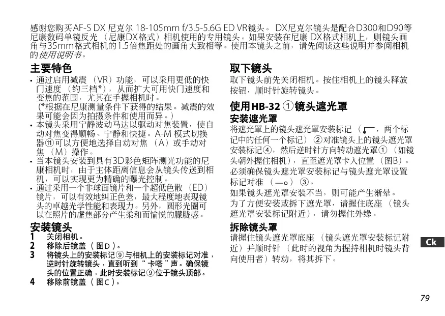 感謝您購買AF-S DX 尼克爾 18-105mm f/3.5-5.6G ED VR鏡頭。DX尼克爾鏡頭是配合D300和D90等尼康數位SLR (尼康DX格式)相機使用的專用鏡頭。如果安裝在尼康 DX格式相機上,則鏡頭畫角與35mm格式相機的 1.5倍焦距大致相等。使用本鏡頭之前,請先閱讀這些說明並參閱相機的使用說明書。