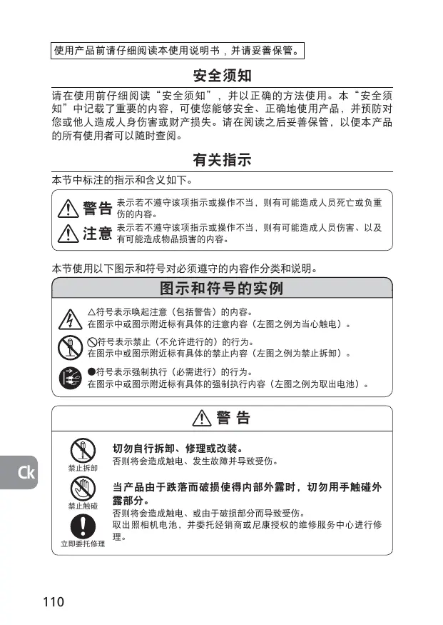 “effektive Blendenzahl”, und die Belichtungskorrektur für die Änderung der effektiven Blendenzahl wird als “Belichtungsfaktor” bezeichnet. Remarques concernant une utilisation en toute sécuritév ATTENTION Ne démontez pas le matériel Le fait de toucher aux pièces internes de l’appareil ou de l’objectif pourrait entraîner des blessures. Les réparations doivent être effectuées uniquement par des techniciens qualifiés. Si l’appareil ou l’objectif est cassé suite à une chute ou un autre accident, apportez le produit dans un centre de service agréé Nikon pour le faire vérifier après avoir débranché le produit et/ou retiré l'accumulateur ou les piles.