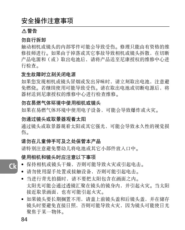 安全操作注意事項 警告 勿自行拆卸 觸動相機或鏡頭的內部零件可能會導致受傷-修理只能由有資格的維 修技師進行-如果由於掉落或其它事故導致相機或鏡頭拆散﹐在切斷 產品電源和(或)取出電池後﹐請將產品送至尼康授權的維修中心進 行檢查發生故障時立刻關閉電源 如果您發現相機或鏡頭冒煙或發出異味時﹐請立刻取出電池﹐注意避 免燃燒-若繼續使用可能導致受傷-請在取出電池或切斷電源後﹐將 器材送到尼康授權的維修中心進行檢查維修勿在易燃氣體環境中使用相機或鏡頭 如果在易燃氣體環境中使用電子設備﹐可能會導致爆炸或火災勿通過鏡頭或取景器觀看太陽 通過鏡頭或取景器觀看太陽或其它強光﹐可能會導致永久性的視覺損 傷請勿在兒童伸手可及之處保管本產品 請特別注意避免嬰幼兒將電池或其它小部件放入口中-