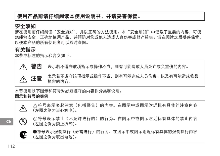 使用产品前请仔细阅读本使用说明书,并请妥善保管。 安全须知 请在使用前仔细阅读“安全须知”,并以正确的方法使用。本“安全须知”中记载了重要的内容,可使 您能够安全、正确地使用产品,并预防对您或他人造成人身伤害或财产损失。请在阅读之后妥善保管, 以便本产品的所有使用者可以随时查阅。