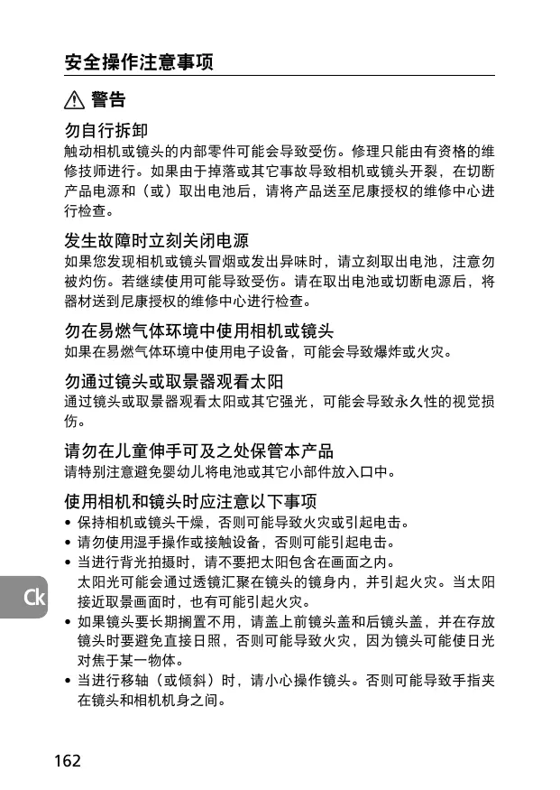 Beim Berühren der Innenteile von Kamera oder Objektiv droht Verletzungsgefahr. Überlass en Sie Reparaturen unbedingt ausschließlich qualifizierten Technikern. Kommt es durch einen heftigen Stoß (z.B. Fall auf den Boden) zu einem Bruch von Kamera oder Objektiv, so trennen Sie zunächst das Produkt vom Stromnetz bzw. entnehmen die Akkus/Batterien, und geben es dann an eine autorisierte Nikon-Servicestelle zur Überprüfung ab.