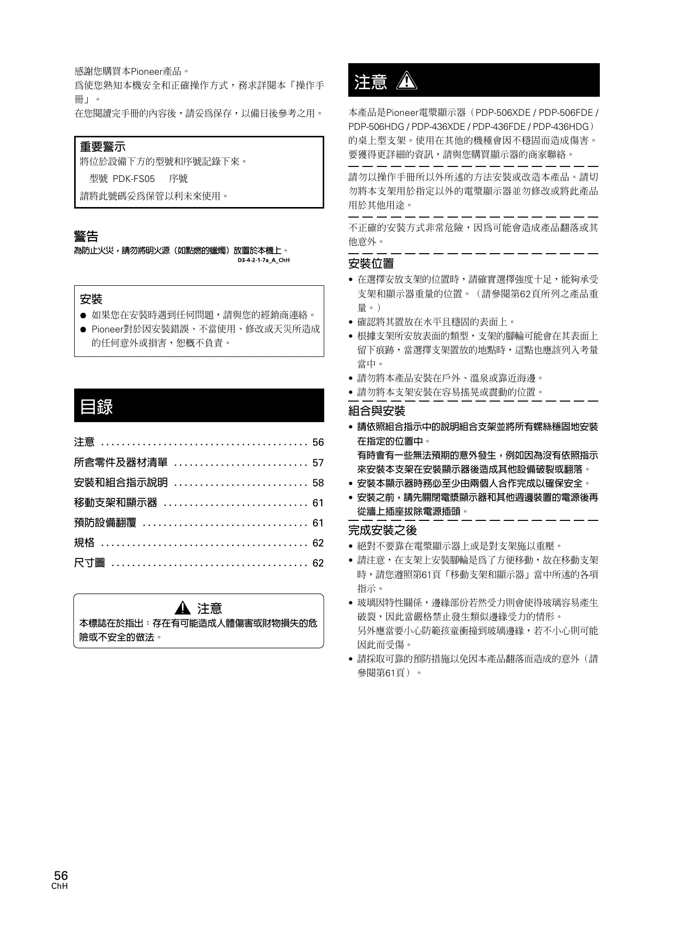 本產品是Pioneer電漿顯示器(PDP-506XDE / PDP-506FDE / PDP-506HDG / PDP-436XDE / PDP-436FDE / PDP-436HDG) 的桌上型支架。使用在其他的機種會因不穩固而造成傷害。 要獲得更詳細的資訊,請與您購買顯示器的商家聯絡。 請勿以操作手冊所以外所述的方法安裝或改造本產品。請切