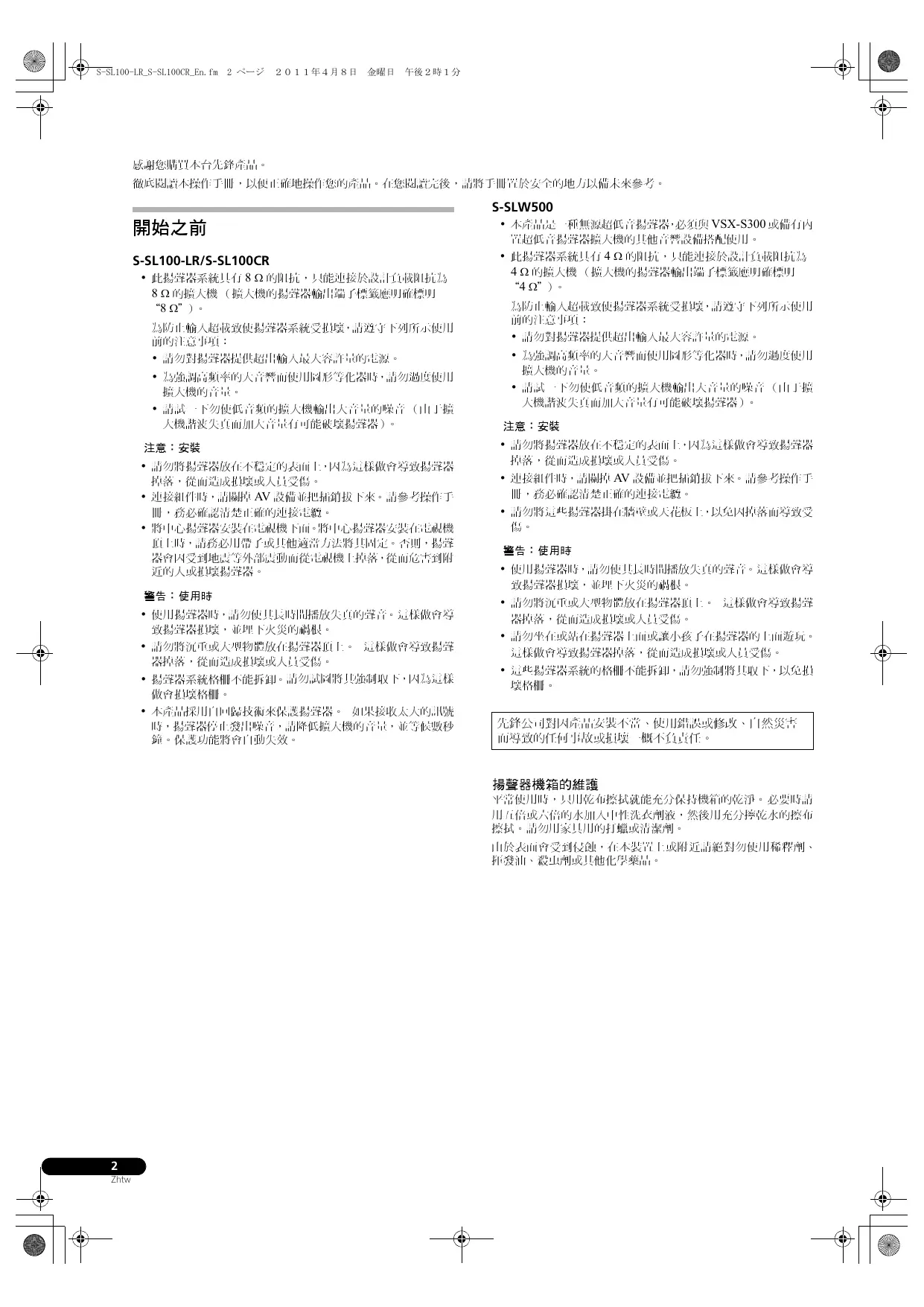 • 本產品是一種無源超低音揚聲器,必須與 VSX-S300 或備有內 置超低音揚聲器擴大機的其他音響設備搭配使用。 • 此揚聲器系統具有 4 Ω 的阻抗,只能連接於設計負載阻抗為 4 Ω 的擴大機 (擴大機的揚聲器輸出端子標籤應明確標明 “4 Ω")。 為防止輸入超載致使揚聲器系統受損壞,請遵守下列所示使用 前的注意事項: • 請勿對揚聲器提供超出輸入最大容許量的電源。 • 為強調高頻率的大音響而使用圖形等化器時,請勿過度使用 擴大機的音量。 • 請試一下勿使低音頻的擴大機輸出大音量的噪音 (由于擴 大機諧波失真而加大音量有可能破壞揚聲器)。 注意: 安裝 • 請勿將揚聲器放在不穩定的表面上,因為這樣做會導致揚聲器 掉落,從而造成損壞或人員受傷。 • 連接組件時,請關掉 AV 設備並把插銷拔下來。 請參考操作手 冊,務必確認清楚正確的連接電纜。 • 請勿將這些揚聲器掛在牆壁或天花板上,以免因掉落而導致受 傷。 警告: 使用時 • 使用揚聲器時,請勿使其長時間播放失真的聲音。這樣做會導 致揚聲器損壞,並埋下火災的禍根。 • 請勿將沉重或大型物體放在揚聲器頂上。 這樣做會導致揚聲 器掉落,從而造成損壞或人員受傷。 • 請勿坐在或站在揚聲器上面或讓小孩子在揚聲器的上面遊玩。 這樣做會導致揚聲器掉落,從而造成損壞或人員受傷。 • 這些揚聲器系統的格柵不能拆卸,請勿強制將其取下,以免損 壞格柵。