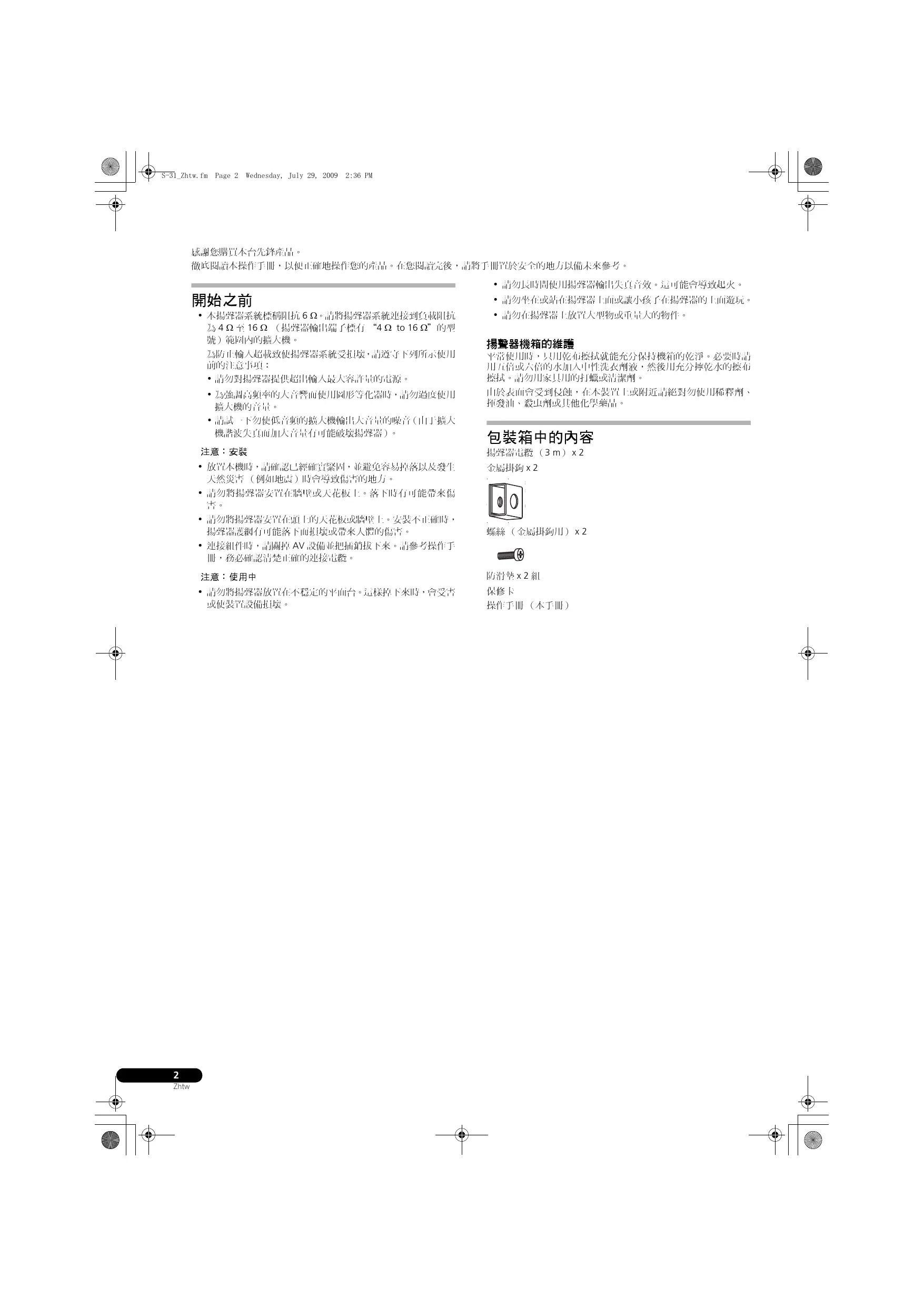 附件 揚聲器電纜 (3 m) . . . . . . . . . . . . . . . . . . . . . . . . . . . . . . . . . . . . . 2 金屬掛鉤 . . . . . . . . . . . . . . . . . . . . . . . . . . . . . . . . . . . . . . . . . . . . . 2 螺絲 (金屬掛鉤用). . . . . . . . . . . . . . . . . . . . . . . . . . . . . . . . . . . . . 2 防滑墊 . . . . . . . . . . . . . . . . . . . . . . . . . . . . . . . . . . . . . . . . . . . . .2 組 保修卡 操作手冊 (本手冊)
