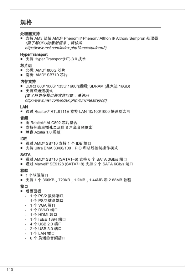 ■ 支持 AM3 封装 AMD® PhenomII/ Phenom/ Althon II/ Althon/ Sempron 处理器 (要了解CPU的最新信息,请访问 http://www.msi.com/index.php?func=cpuform2) HyperTransport ■ 支持 Hyper Transport(HT) 3.0 技术 ■ 北桥: AMD® 880G 芯片 ■ 南桥: AMD® SB710 芯片 ■ DDR3 800/ 1066/ 1333/ 1600*(超频) SDRAM (最大达 16GB) (要了解更多模组兼容性问题,请访问 http://www.msi.com/index.php?func=testreport) LAN ■ 通过 Realtek® RTL8111E 支持 LAN 10/100/1000 快速以太网 ■ 由 Realtek® ALC892 芯片整合 ■ 支持带感应插孔灵活的 8 声道音频输出 ■ 兼容 Azalia 1.0 规范 IDE