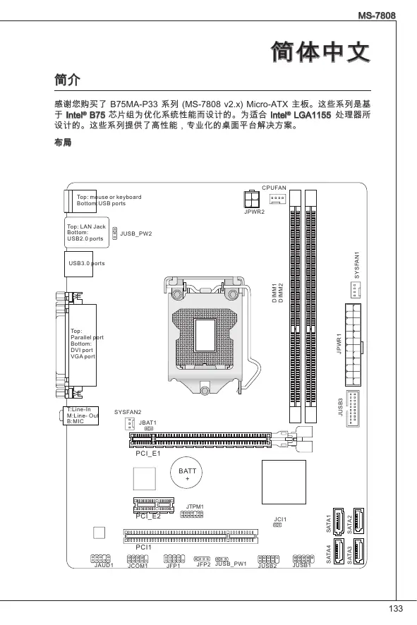 感谢您购买了 B75MA-P33 系列 (MS-7808 v2.x) Micro-ATX 主板。这些系列是基 于 Intel® B75 芯片组为优化系统性能而设计的。为适合 Intel® LGA1155 处理器所 设计的。这些系列提供了高性能,专业化的桌面平台解决方案。