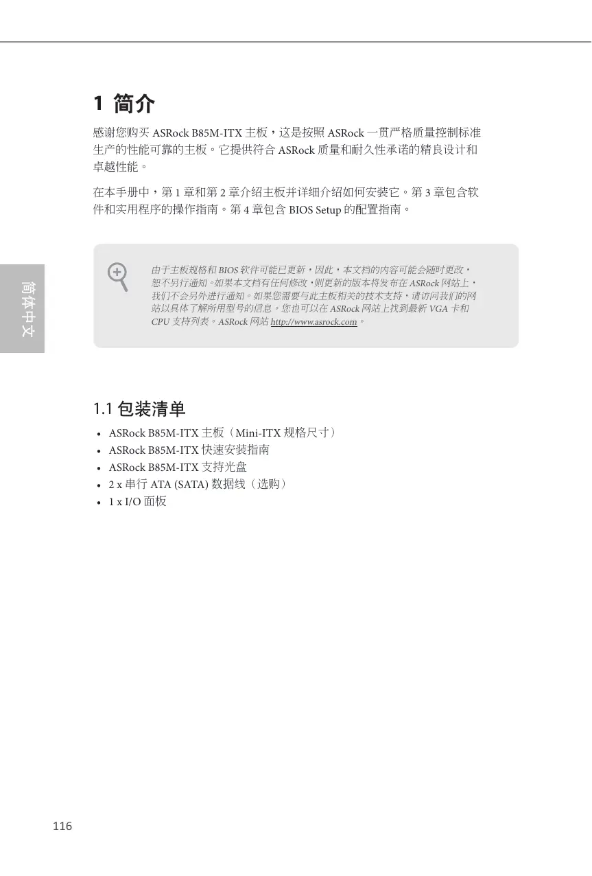 1 簡介 感謝您購買 ASRock B85M-ITX 主機板,本主機板經 ASRock 嚴格品管製作,是 一套讓人信賴的可靠產品。本產品採耐用設計所展現的優異效能,完全符合 ASRock 對品質及耐用度的承諾。