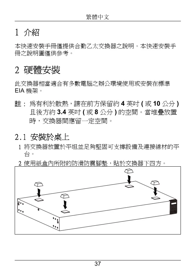 2.1 安裝於桌上 1 將交換器放置於平坦並足夠堅固可支撐設備及連接線材的平 台。 2 使用紙盒內所附的防滑防震腳墊,貼於交換器下四方。
