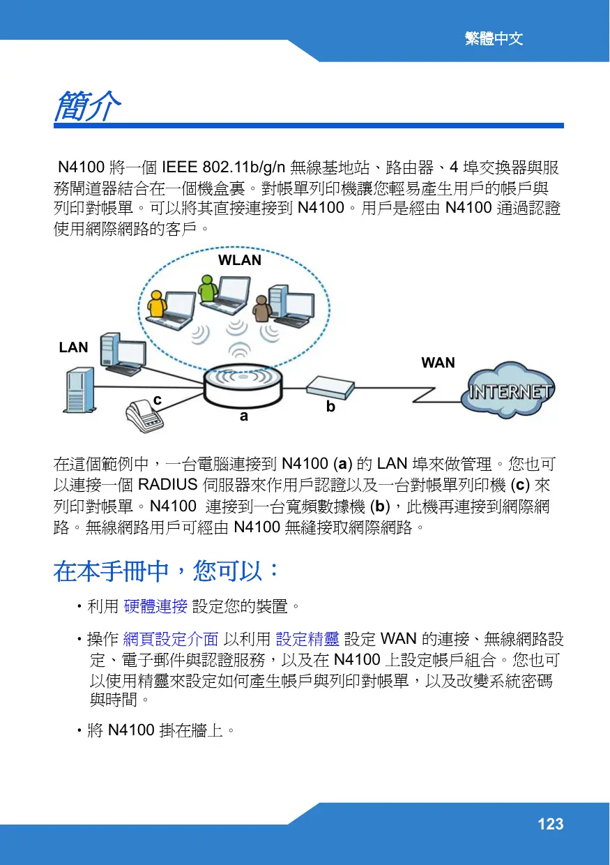 簡介 N4100 將一個 IEEE 802.11b/g/n 無線基地站、路由器、4 埠交換器與服 務閘道器結合在一個機盒裏。對帳單列印機讓您輕易產生用戶的帳戶與 列印對帳單。可以將其直接連接到 N4100。 用戶是經由 N4100 通過認證 使用網際網路的客戶。