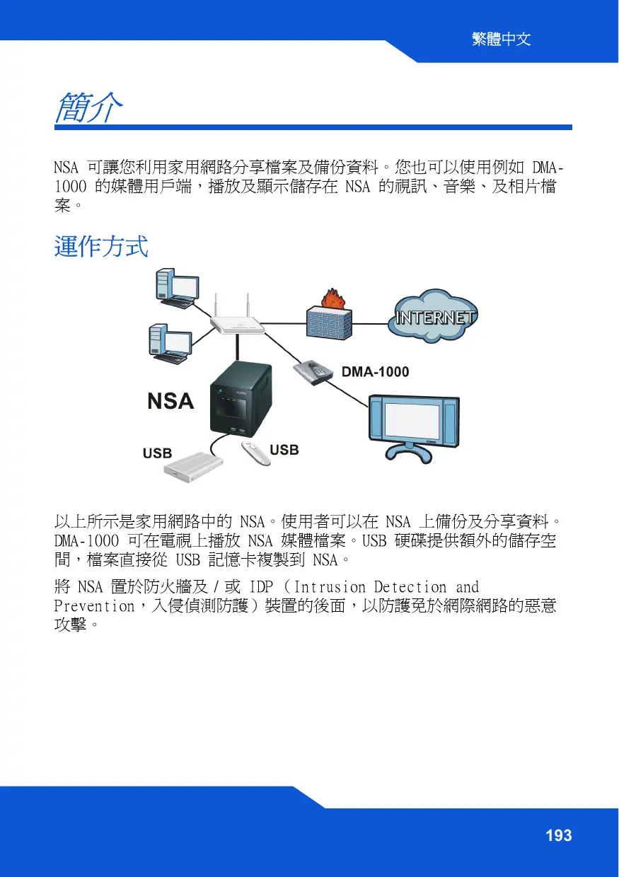 以上所示是家用網路中的 NSA。使用者可以在 NSA 上備份及分享資料。 DMA-1000 可在電視上播放 NSA 媒體檔案。USB 硬碟提供額外的儲存空 間,檔案直接從 USB 記憶卡複製到 NSA。 將 NSA 置於防火牆及 / 或 IDP (Intrusion Detection and Prevention,入侵偵測防護)裝置的後面,以防護免於網際網路的惡意 攻擊。