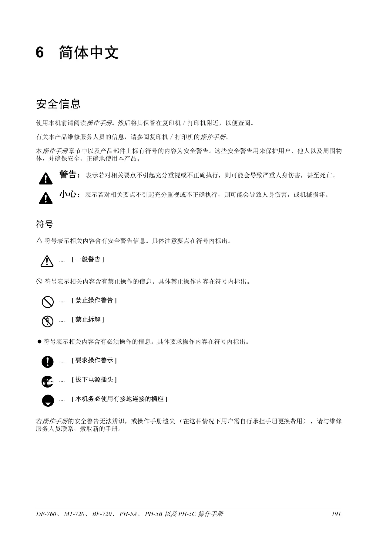 DF-760, MT-720, BF-720, PH-5A, PH-5B E PH-5C GUIDA DI FUNZIONAMENTO 6 简体中文 使用本机前请阅读操作手册。然后将其保管在复印机/打印机附近,以便查阅。 有关本产品维修服务人员的信息,请参阅复印机/打印机的操作手册。 本操作手册 章节中以及产品部件上标有符号的内容为安全警告。这些安全警告用来保护用户、他人以及周围物 体,并确保安全、正确地使用本产品。 警告:表示若对相关要点不引起充分重视或不正确执行,则可能会导致严重人身伤害,甚至死亡。 小心:表示若对相关要点不引起充分重视或不正确执行,则可能会导致人身伤害,或机械损坏。 符号表示相关内容含有安全警告信息。具体注意要点在符号内标出。