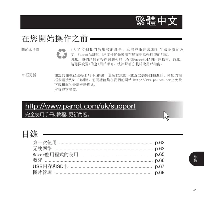Sm@ l'environnement, Parrot privilégie la mise en ligne des documents utlisateurs plutôt que leur impression. Nous vous invitons donc à consuter le guide utilisateur du Parrot DIA directement sur votre cadre photo. Pour cela, sélectionnez Réglages > Informations > Guide utilisateur. Les men-