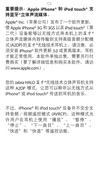 - La mise à jour logicielle Apple® 3.0 ne permet la prise en charge d'aucune fonctionnalité AVRCP de votre casque d'écoute Jabra HALO vers l'iPhone® ou l'iPod touch®. - La mise à jour logicielle Apple® 3.1 permet la prise en charge des fonctions Jouer, Pause et Arrêt. Aucune des fonctions Avancer, Reculer, Avance rapide et Recul rapide n'est prise en charge. Veuillez noter que vous pouvez toujours répondre et mettre fin aux appels (et régler le volume) directement de votre casque d'écoute Jabra si vous avez installé la mise à jour logicielle iPhone® 3.0 ou ultérieure sur votre iPhone® 3G ou 3GS ou iPod touch® (2e génération) d'Apple.