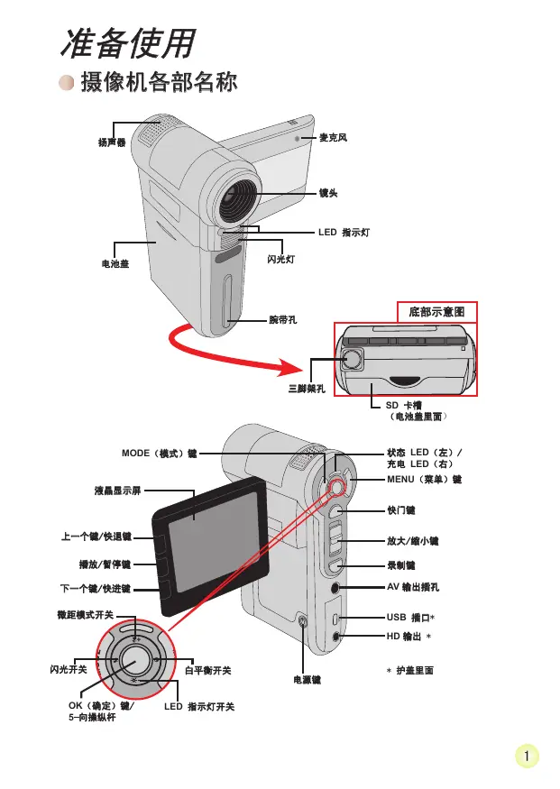 目录 准备使用 1 摄像机各部名称 1 安装电池 2 电池充电 2 插入存储卡(选配件) 3 打开/关闭摄像机电源 3 设置语言 4 设置时间 4 操作画面图示 5