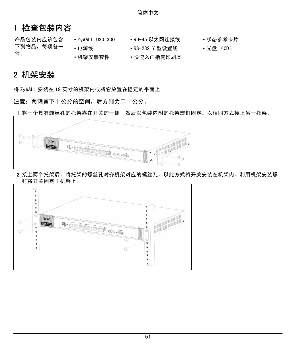 2 机架安装 将 ZyWALL 安装在 19 英寸的机架内或将它放置在稳定的平面上。