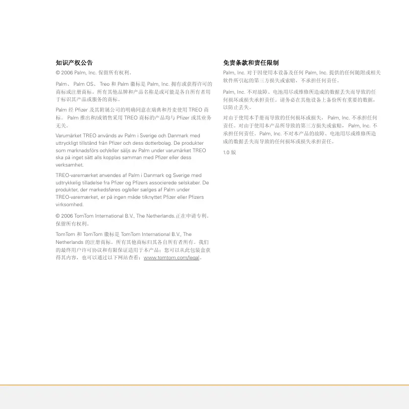 © 2006 年 Palm, Inc. 保留所有權利。 Palm、Palm OS、Treo 以及 Palm 標誌是 Palm, Inc. 所擁有或獲授權 的商標或註冊商標。所有其他品牌與產品名稱均為或可能為各自所有 者擁有之商標,用來辨識各自所有者的產品或服務。 TREO 是 Palm 在瑞典及丹麥經 Pfizer 及其關係公司明確同意而使用的 免責條款與有限責任聲明 對於因使用本裝置及任何 Palm, Inc. 提供的任何隨附或相關軟體所引 起的第三方損失或索賠,Palm, Inc. 不承擔任何責任。 Palm, Inc. 對產品故障、電力不足或維修所導致之資料損失或傷害, 不需擔負任何責任。請務必在其他媒體上備份所有重要的資料,以防