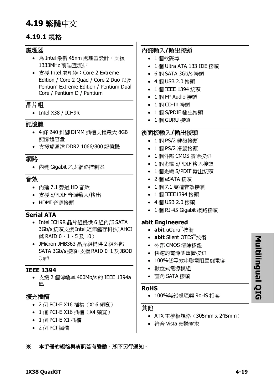 - 符合 Vista 硬體需求 本手冊的規格與資訊若有變動,恕不另行通知。 IX38 QuadGT 4-19