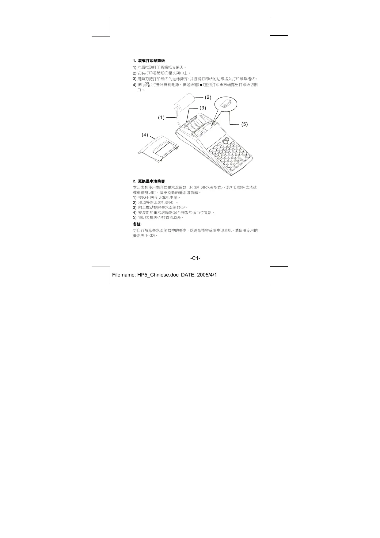 勿自行填充墨水滾筒器中的墨水,以避免損害或阻塞印表機。請使用專用的 墨水夾(IR-30)。 -C1File name: HP5_Chniese.doc DATE: 2005/4/1