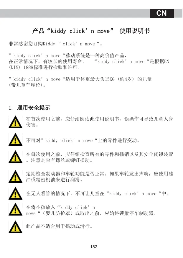 «kiddy click’n move» a été contrôlé et homologué pour répondre à la norme EN (DIN) 1888. Votre «kiddy click’n move» est conçu pour les enfants (4 ans env.) jusqu’à 15 kilos (avec siège poussette).